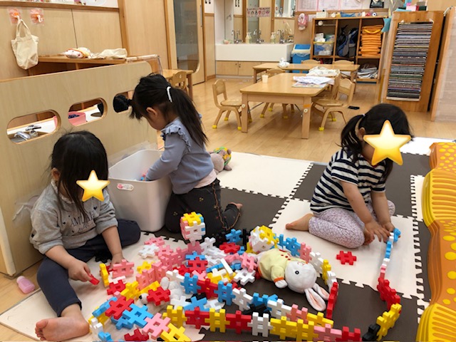 ブロックでお家つくり。長くつなげて広げていました。