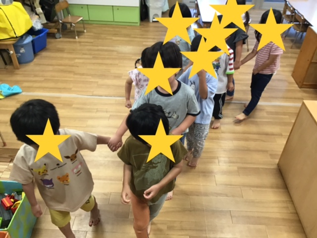今日は運動会に向けて入場の並び順、かけっこの並び順を練習してみました。「○○君、ちゃんの後だね」と子どもたちも自分たちで覚えようと頑張っていましたよ。