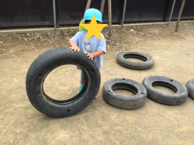 その後は元気よく園庭で過ごしました。追いかけっこをしたり、みんなでケーキ作りをしていたり、タイヤでアスレチックを作っていたりそれぞれ好きな場所で楽しみました。