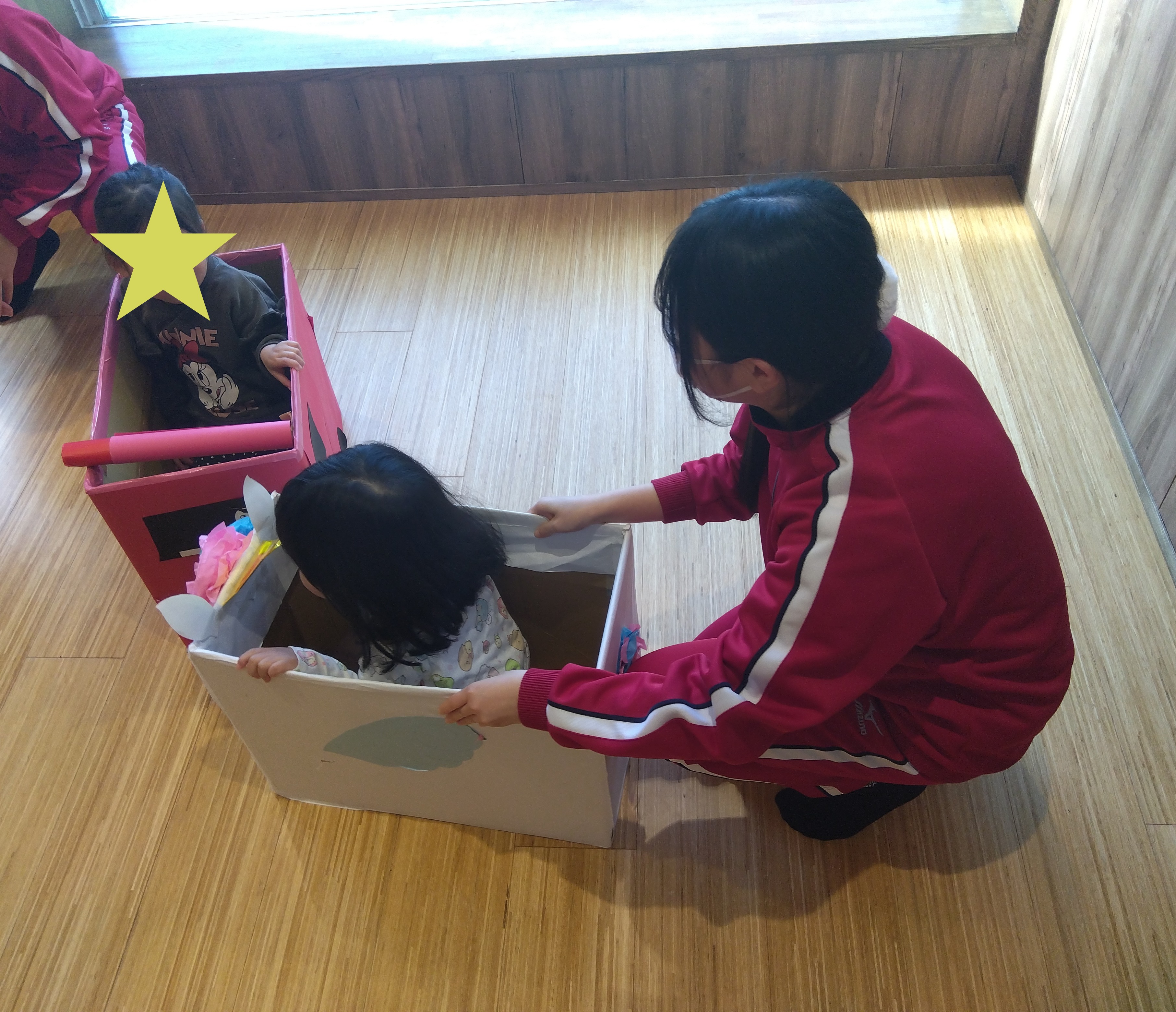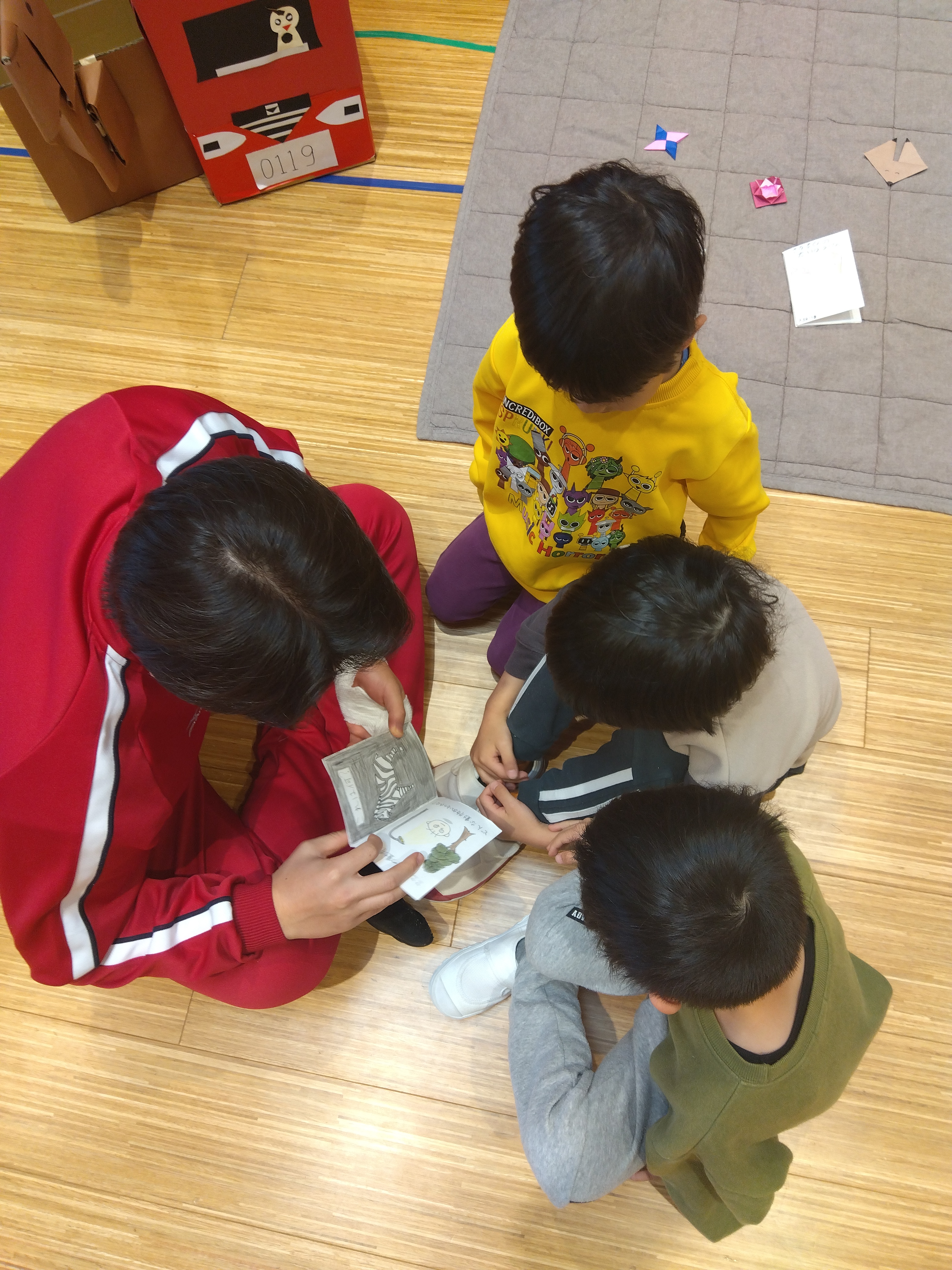 絵本の他にも折り紙や手作りの段ボール車を持ってきてくれました。