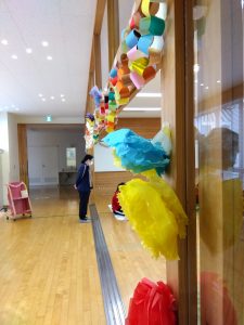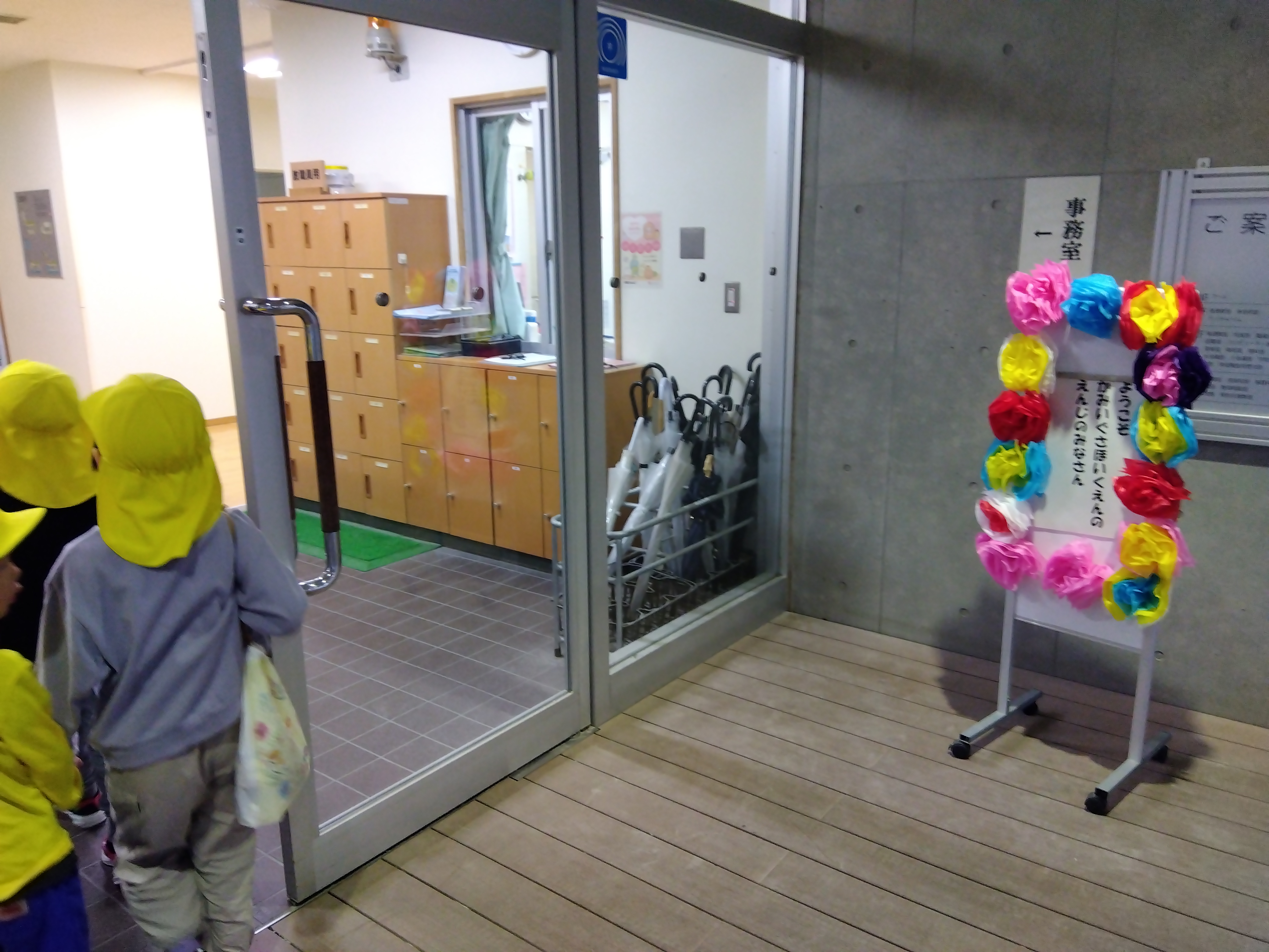 エレベーターに乗って多目的室に向かうと、お兄さんお姉さんが出迎えてくださいました。ちょっと緊張気味でしたが、「えーー、かわいい!!」「可愛すぎる――」と言ってもらえて、恥ずかしくなってしまう、さくら組のみんな。
