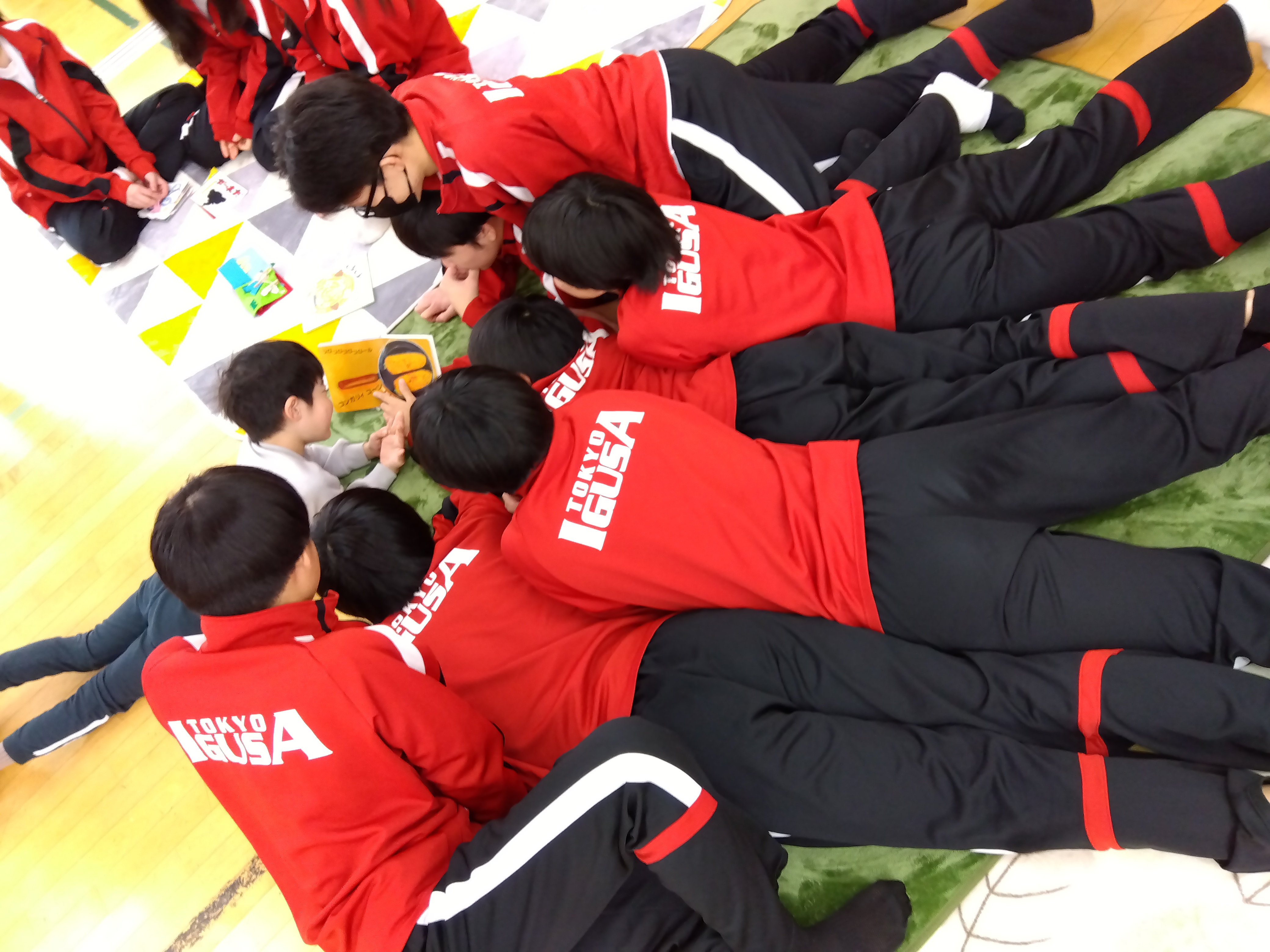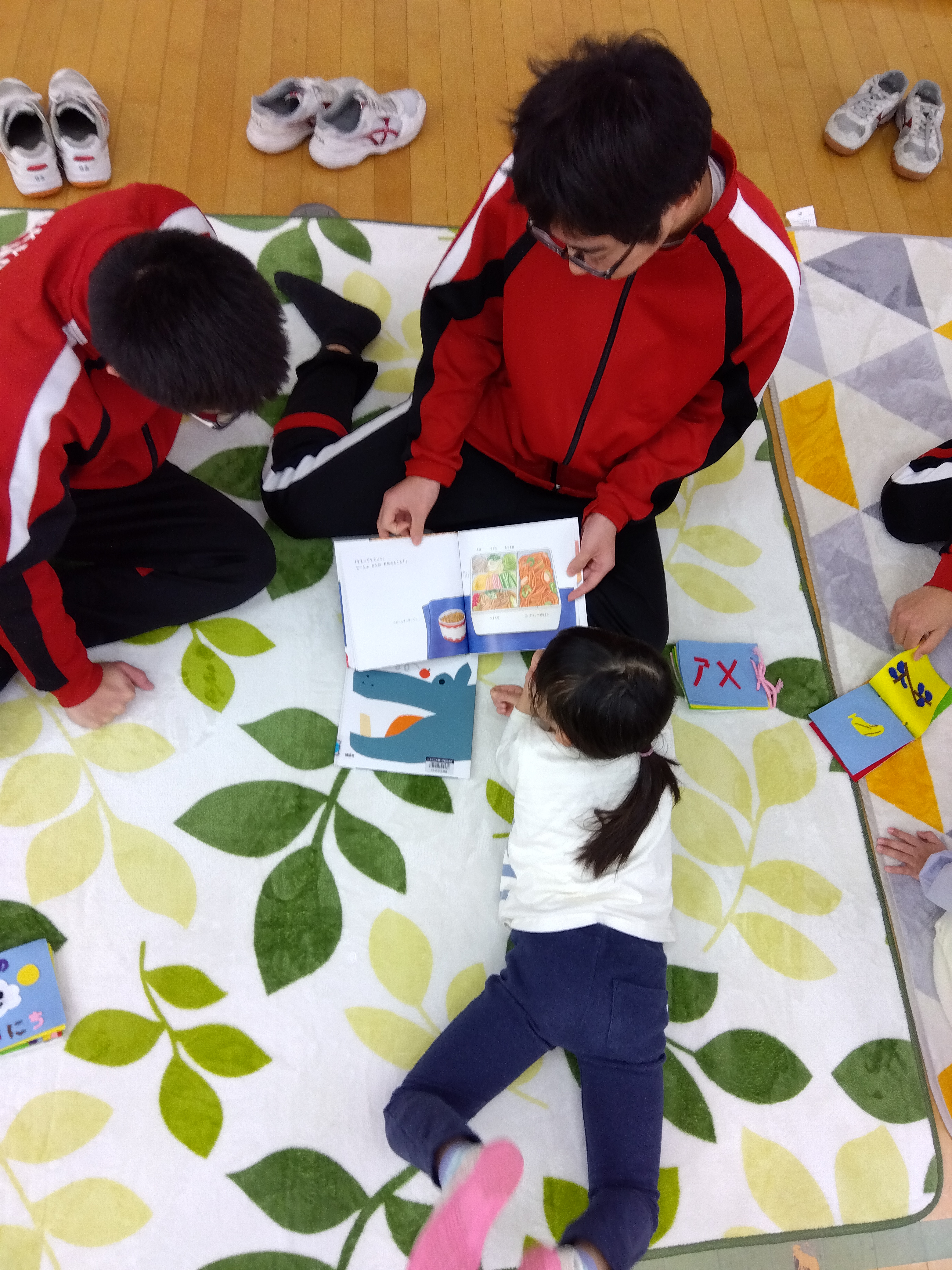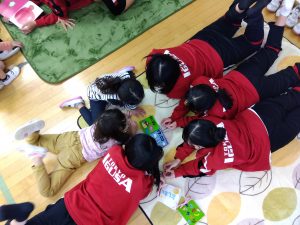 いよいよ、交流が始まると、自分の好きな絵本へ向かうみんな。やさしく迎えてくれた、お兄さんお姉さんとすぐに打ち解けて、最後にはこんなにリラックス。