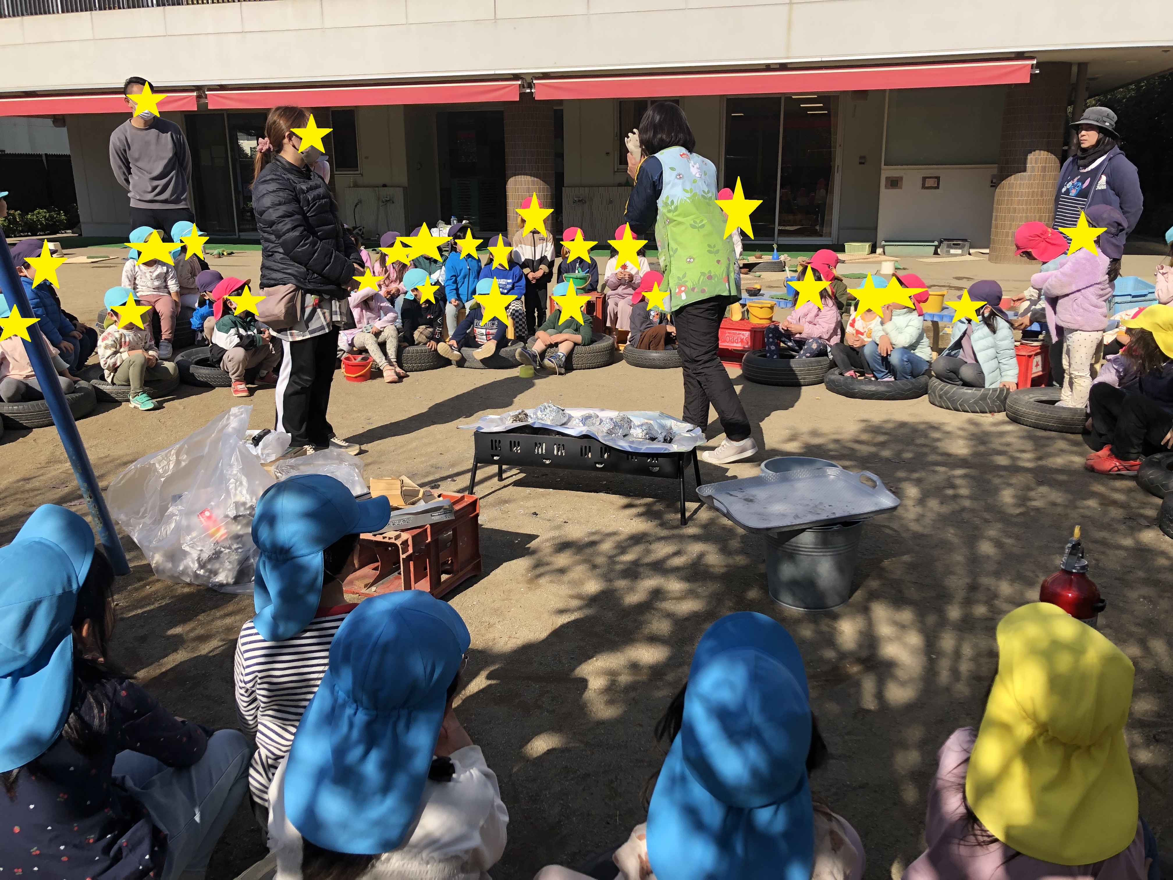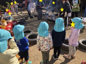 園庭にグリルを設置し、炭に火を点けて焼いていきます。焼き芋が出来上がる様子を離れた場所から見ている子どもたちです。