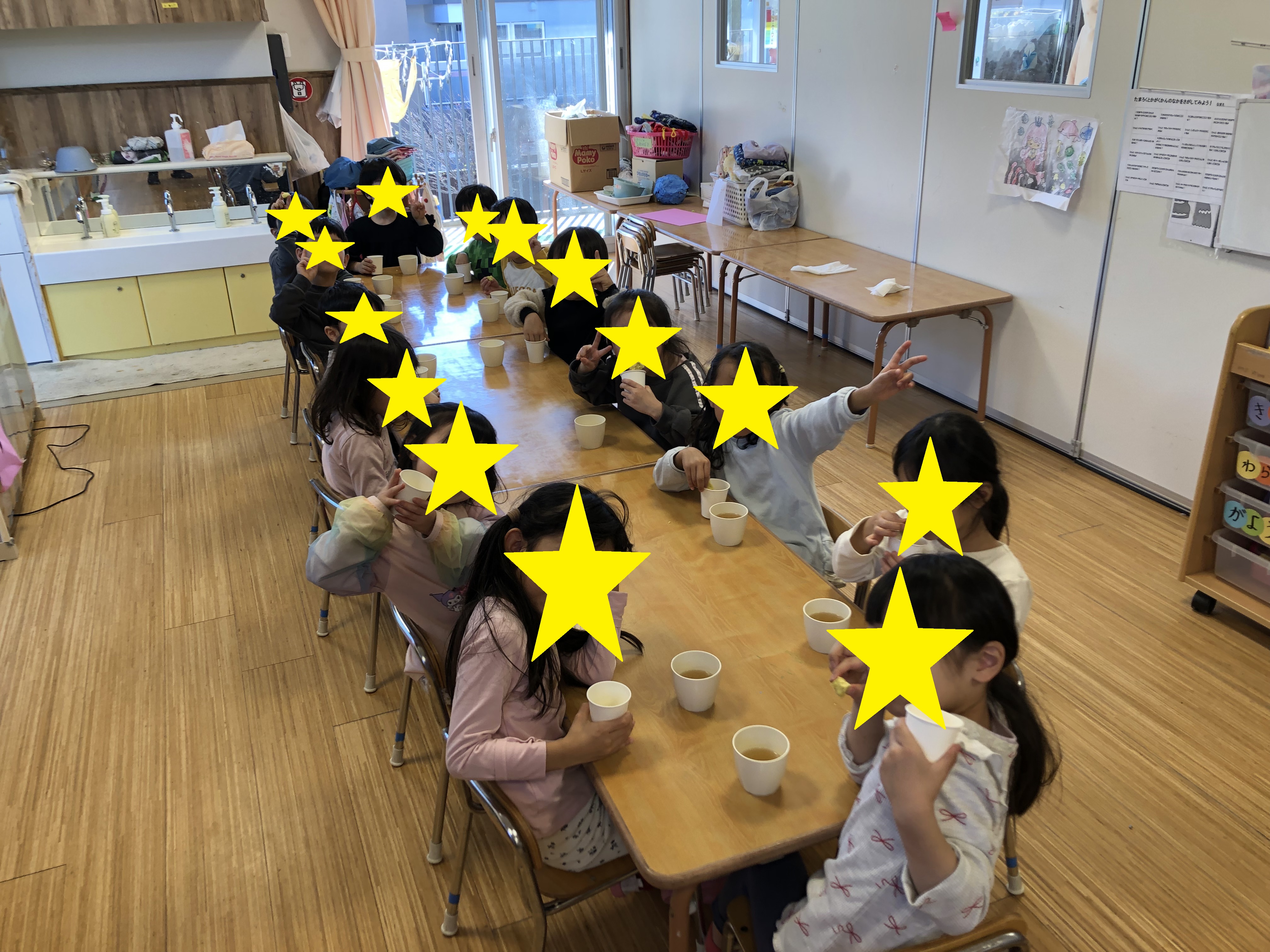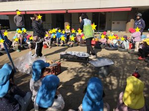 焼き芋が出来上がる頃、3.4.5歳児さん達で集まりお芋クイズや、子どもたちからの質問コーナーをして集会を楽しみました。