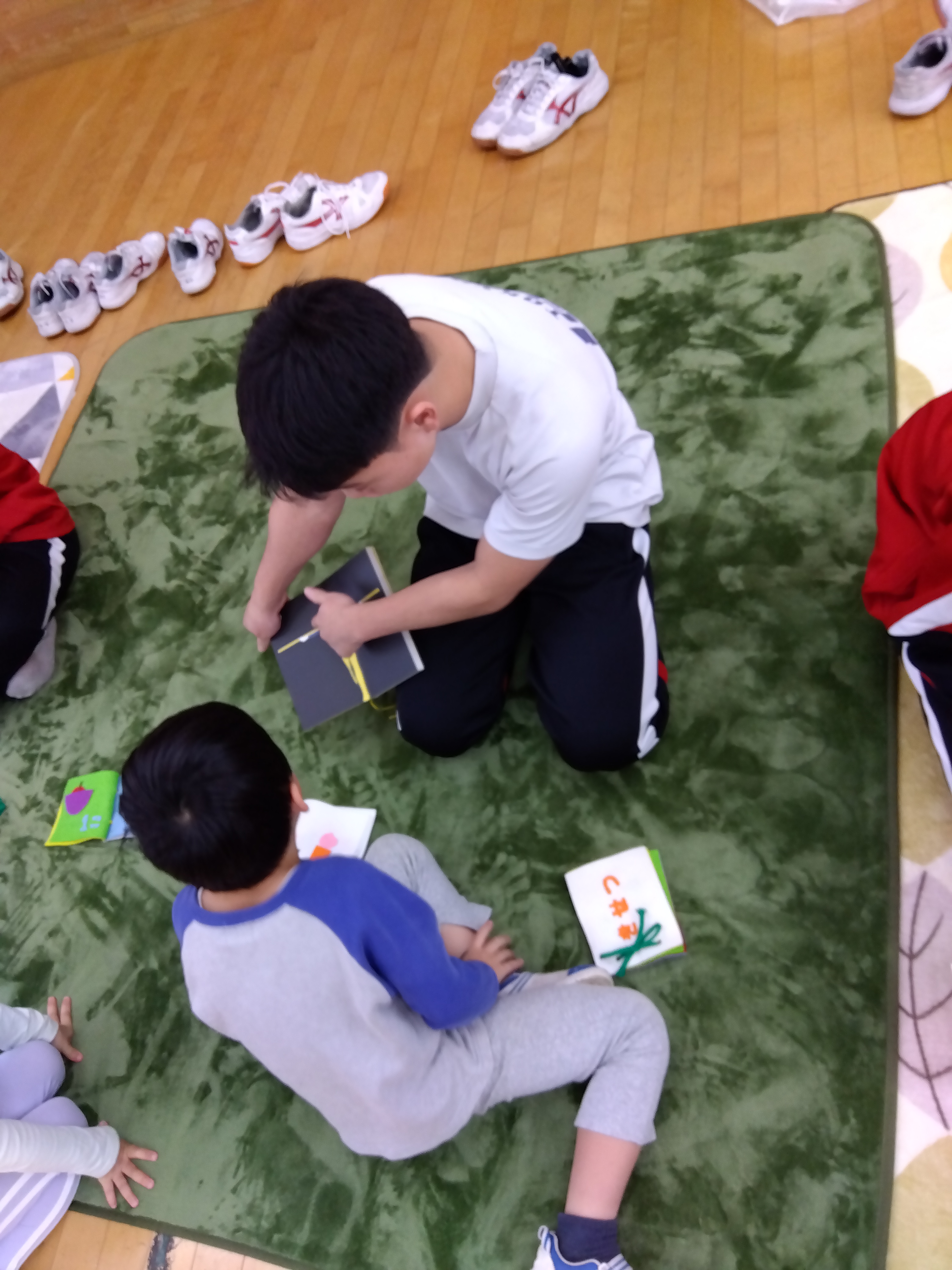 今回の中学生のお兄さんお姉さんはとっても積極的で、「こっちに○○の絵本あるよ!」「ここに座って!」と声をかけてくれました。
