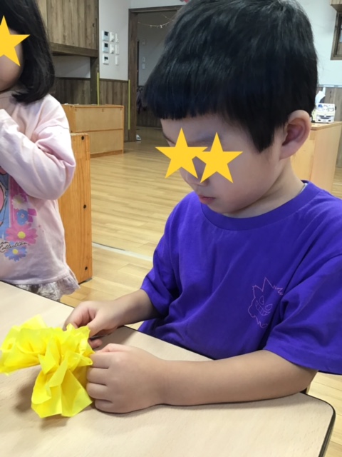 来月運動会があるため準備を行いました。初めて開く花紙に難しさを感じている姿も見られましたが丁寧に行なっていましたよ。