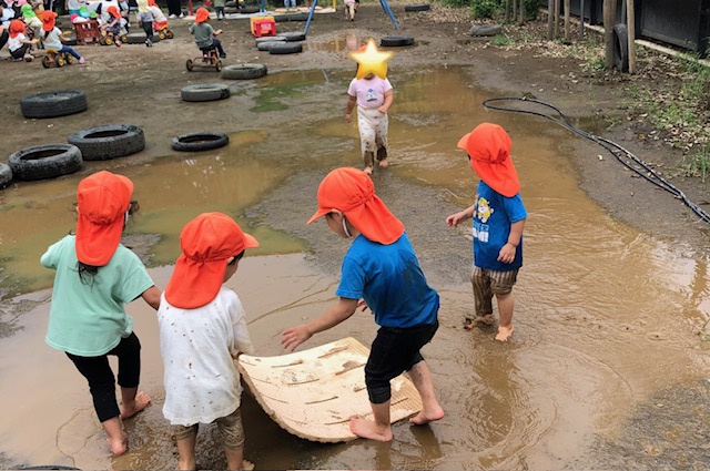 水たまりの中を走り回ったり、バスマットを使って橋を作ったり、大きな水たまりで思いきり楽しんでいました。