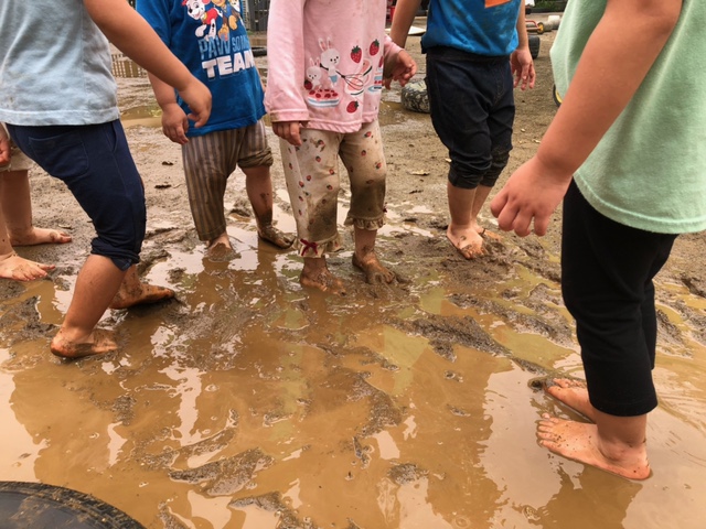 昨日の雨で大きな水たまりができていたので、大喜びで裸足になって遊び始めていた子どもたち。
