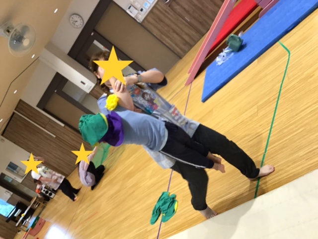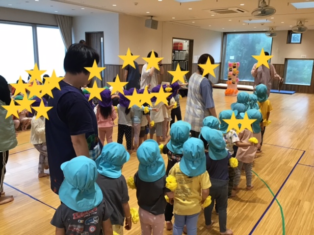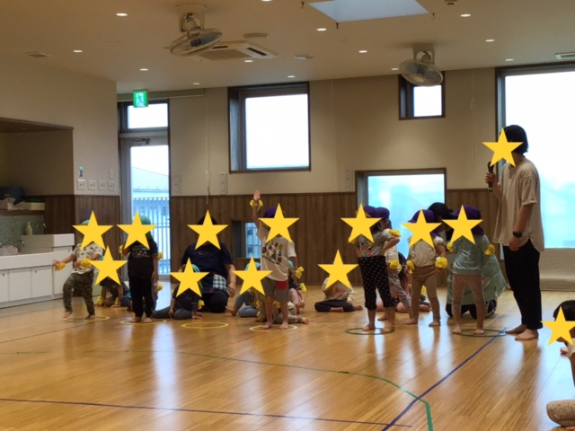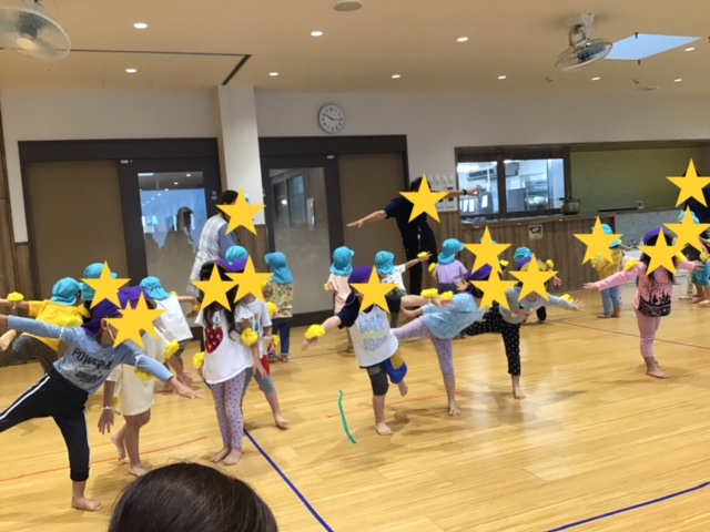 わいわい運動会の曲に合わせて、体操をしたり、ジャンボリミッキーを踊ったりと音楽に合わせて身体をたくさん動かしました。