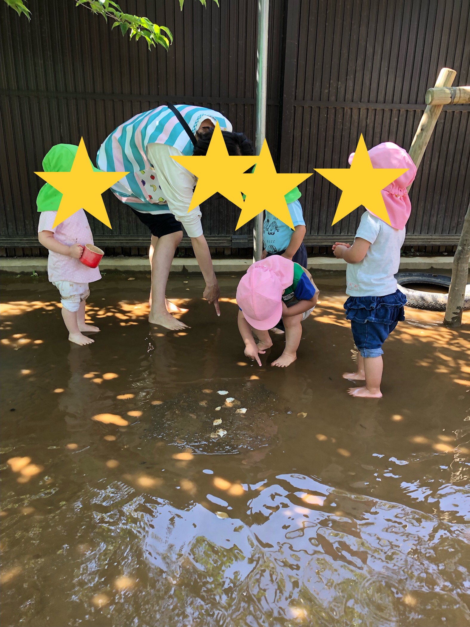 一昨日の雨がまだ残っていて、園庭には大きな水たまりがあったので、靴下と靴は履かずに裸足で遊びました。