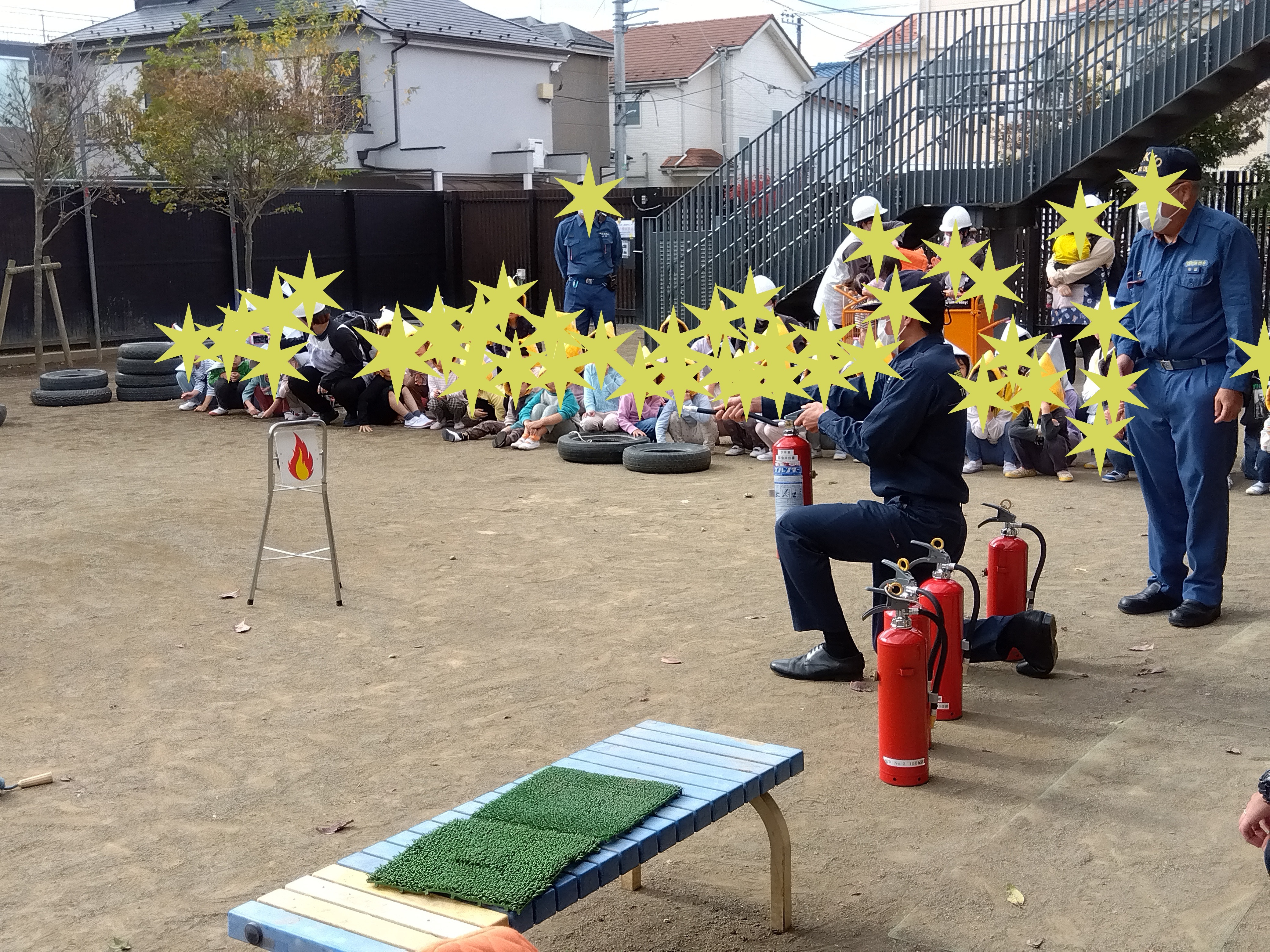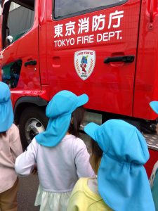 関東地方に地震が発生し、その後、近隣で火災が発生して園庭に避難をするという想定のもと行いました。そして、今回は荻窪消防署下井草出張所の消防士さんが来てくださって、避難訓練と消火訓練の様子を見てくださいました。