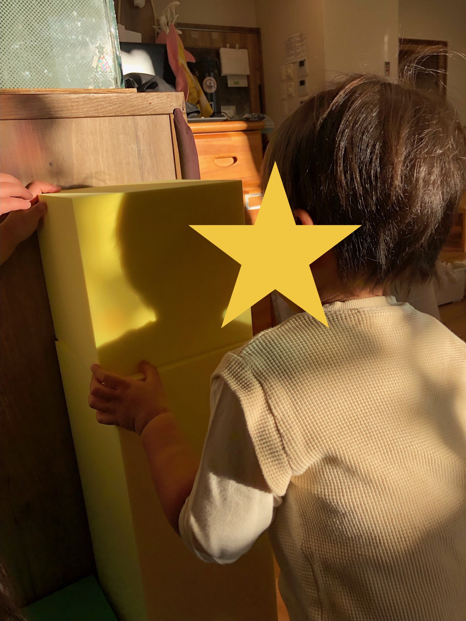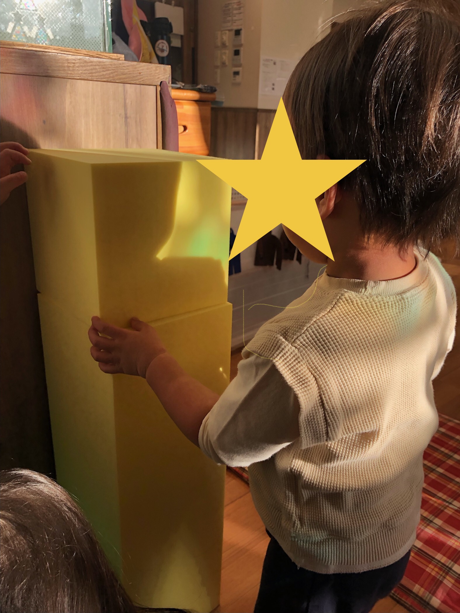 普段茶色の壁ではなかなか気づかない影や光の色。 大型ソフト積み木のカラーに反映された影や光に気付いて子どもたちなりのアプローチや観察をしている姿が見られました。