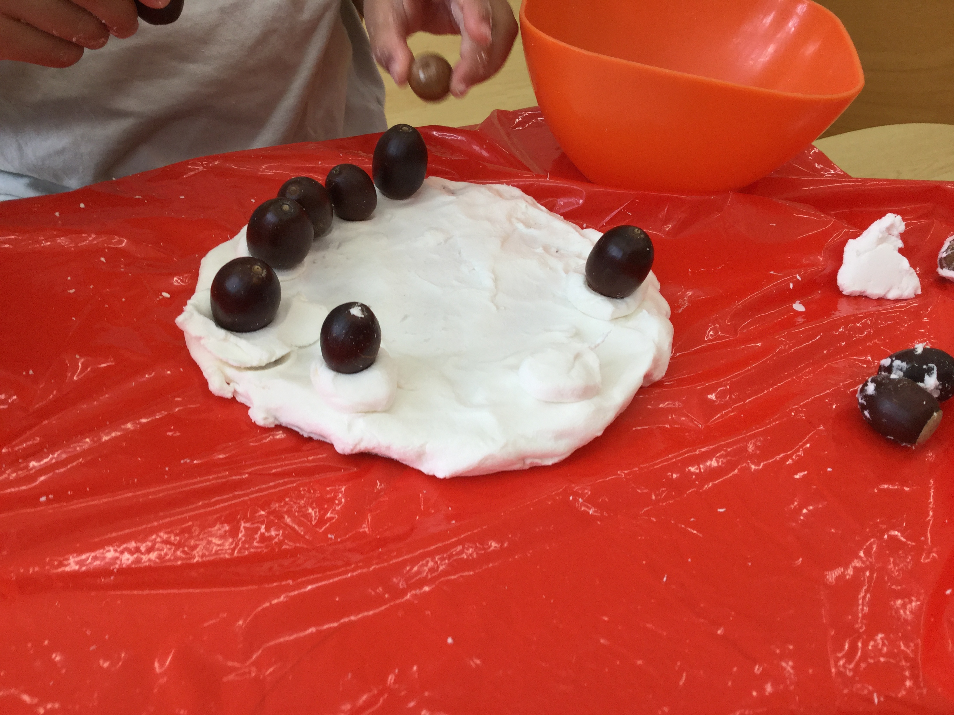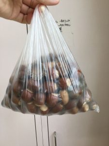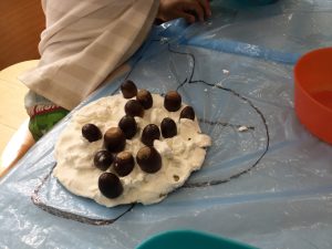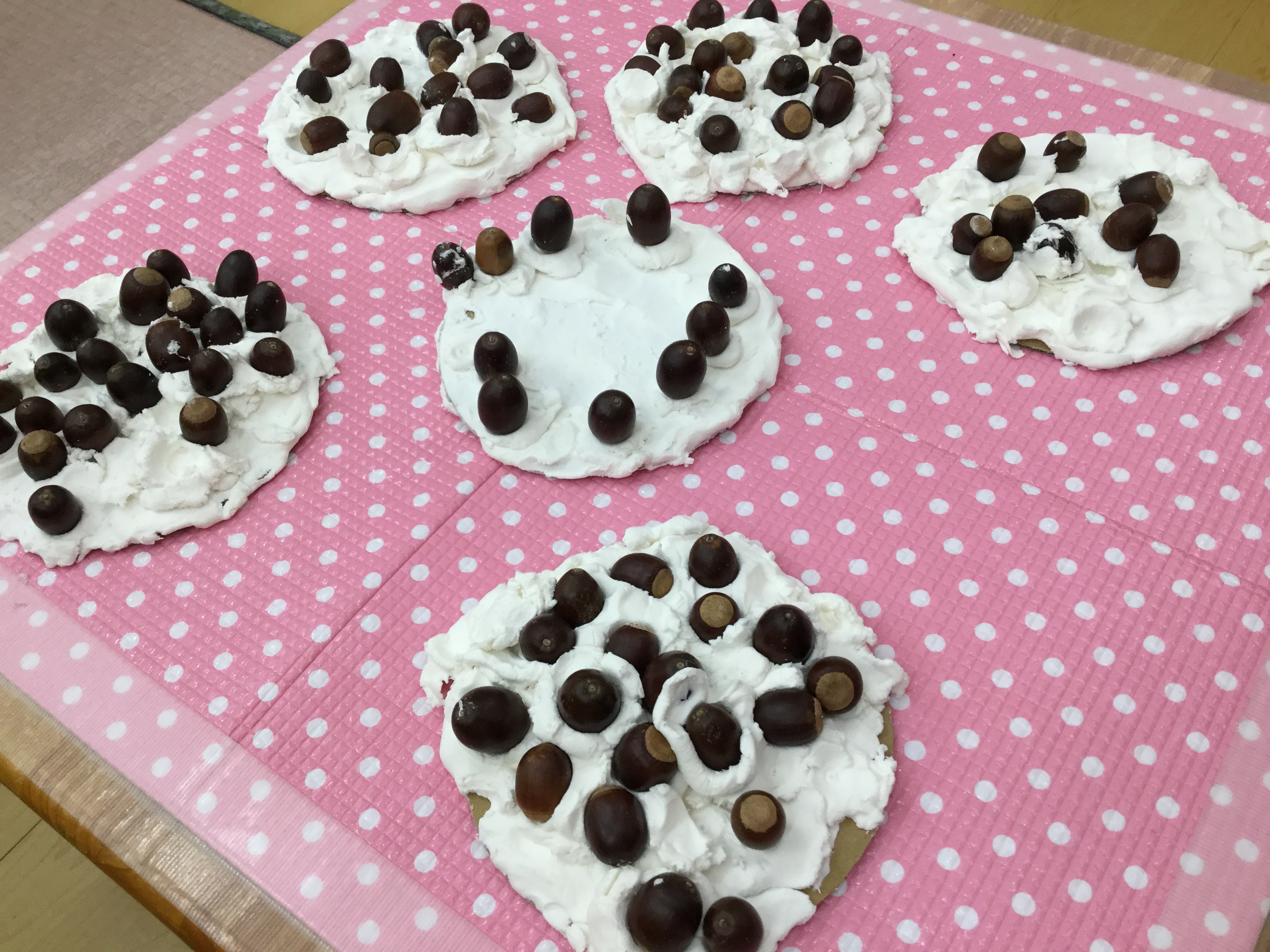 先日、白砂公園に遊びに行った際、たくさんのドングリを発見!袋に集めて持ち帰り、後日の活動で子どもたちとどんぐりケーキを作りました!