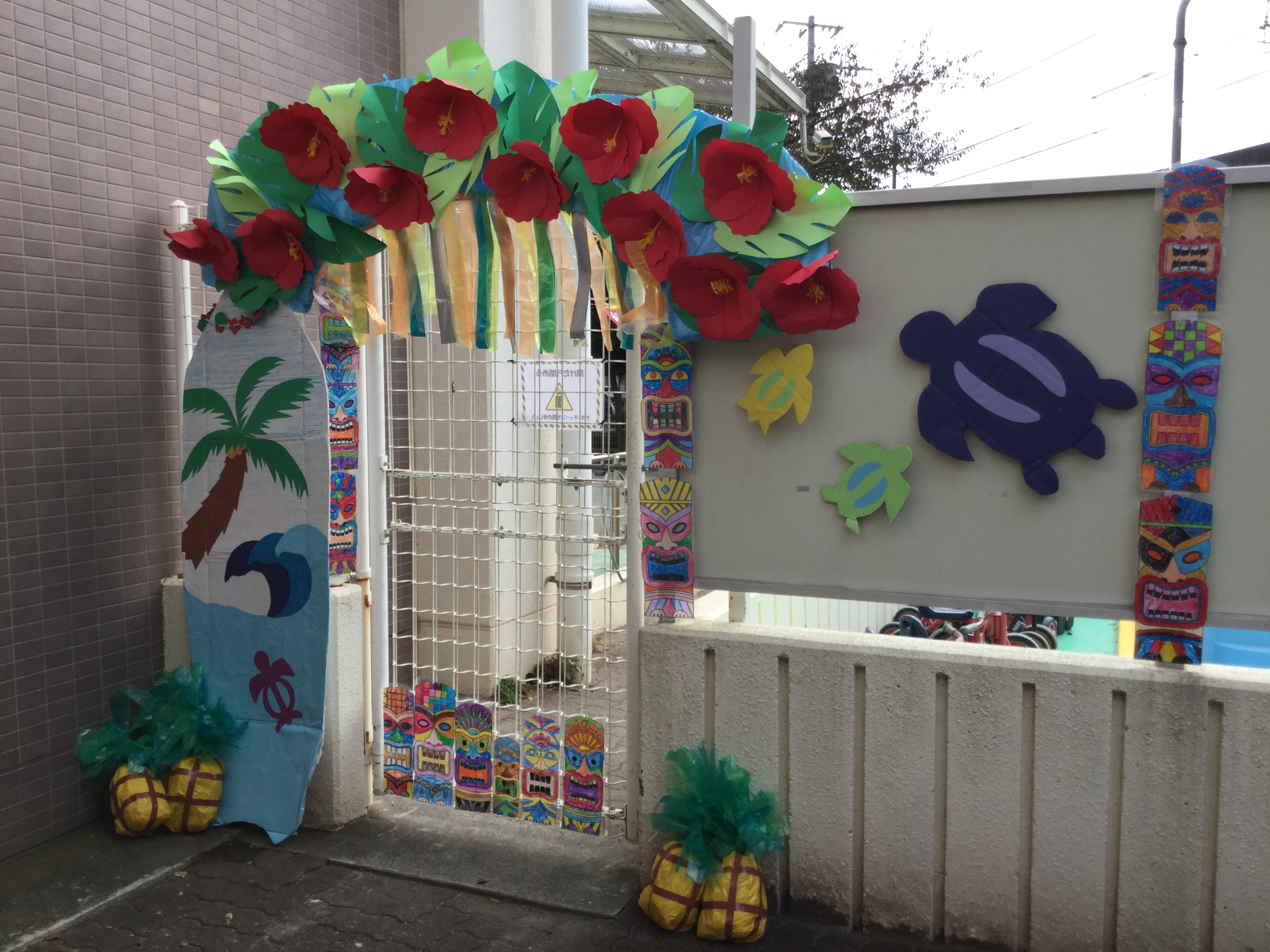 ハワイアンをテーマに、こしみのとレイを付け、フラダンスをしました。