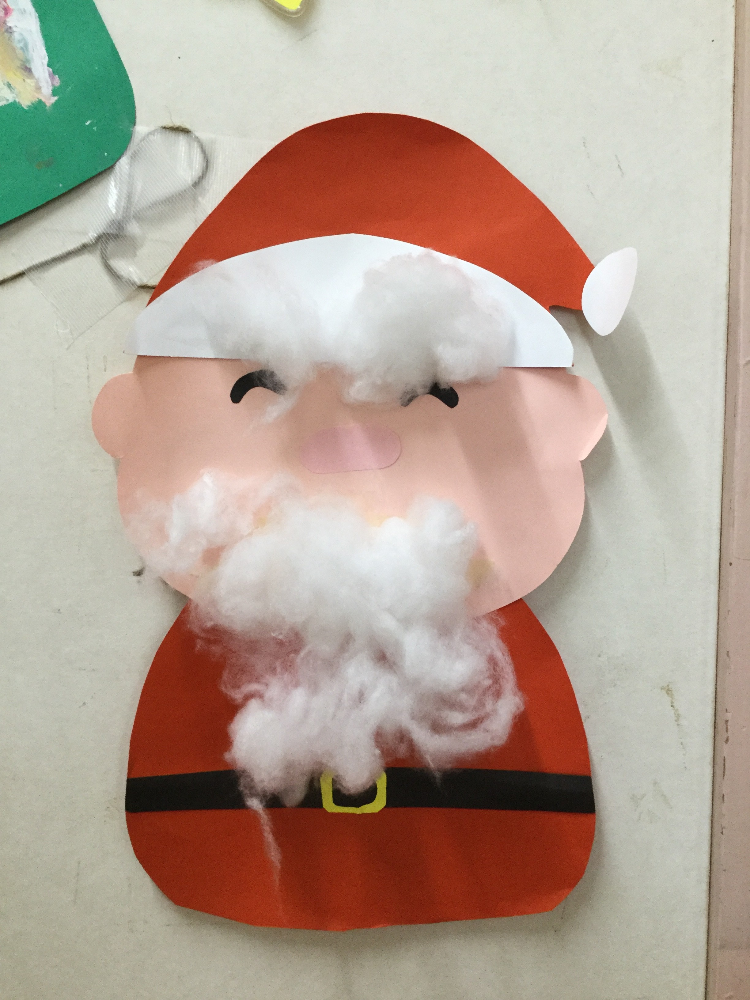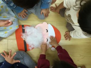 サンタクロースの顔に綿でヒゲや眉毛をつけて、色々な素材に触る経験もしています。