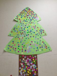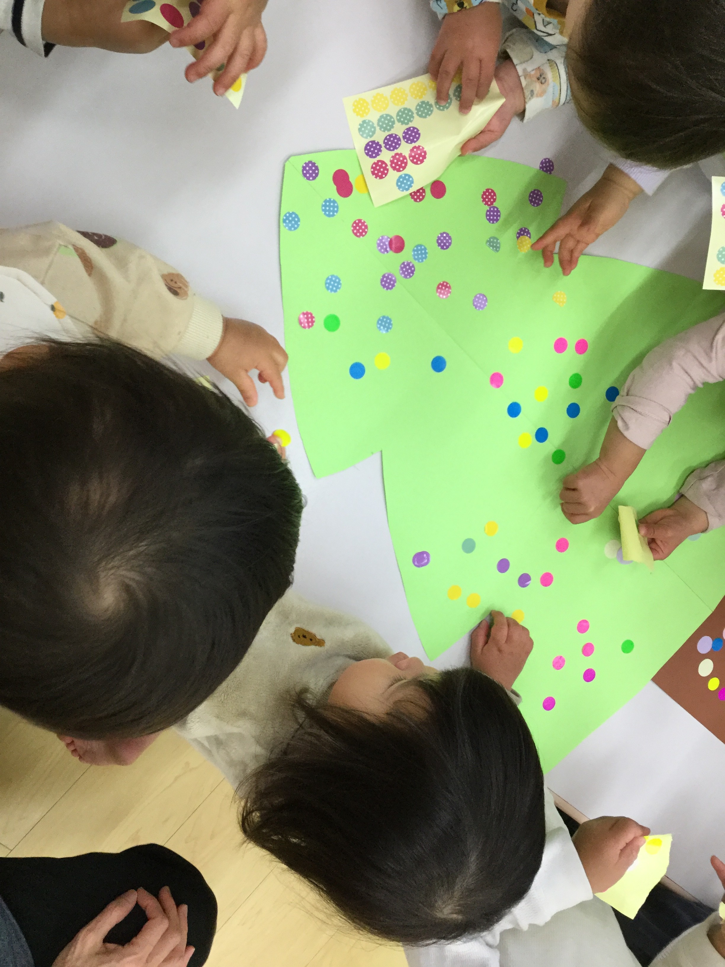 クリスマスツリーにシールをたくさん貼って飾り付けもしました。