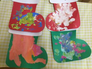 今回はクリスマスに向けて、絵筆やスポンジなど、道具を使った制作をしてみました。
