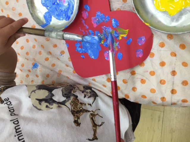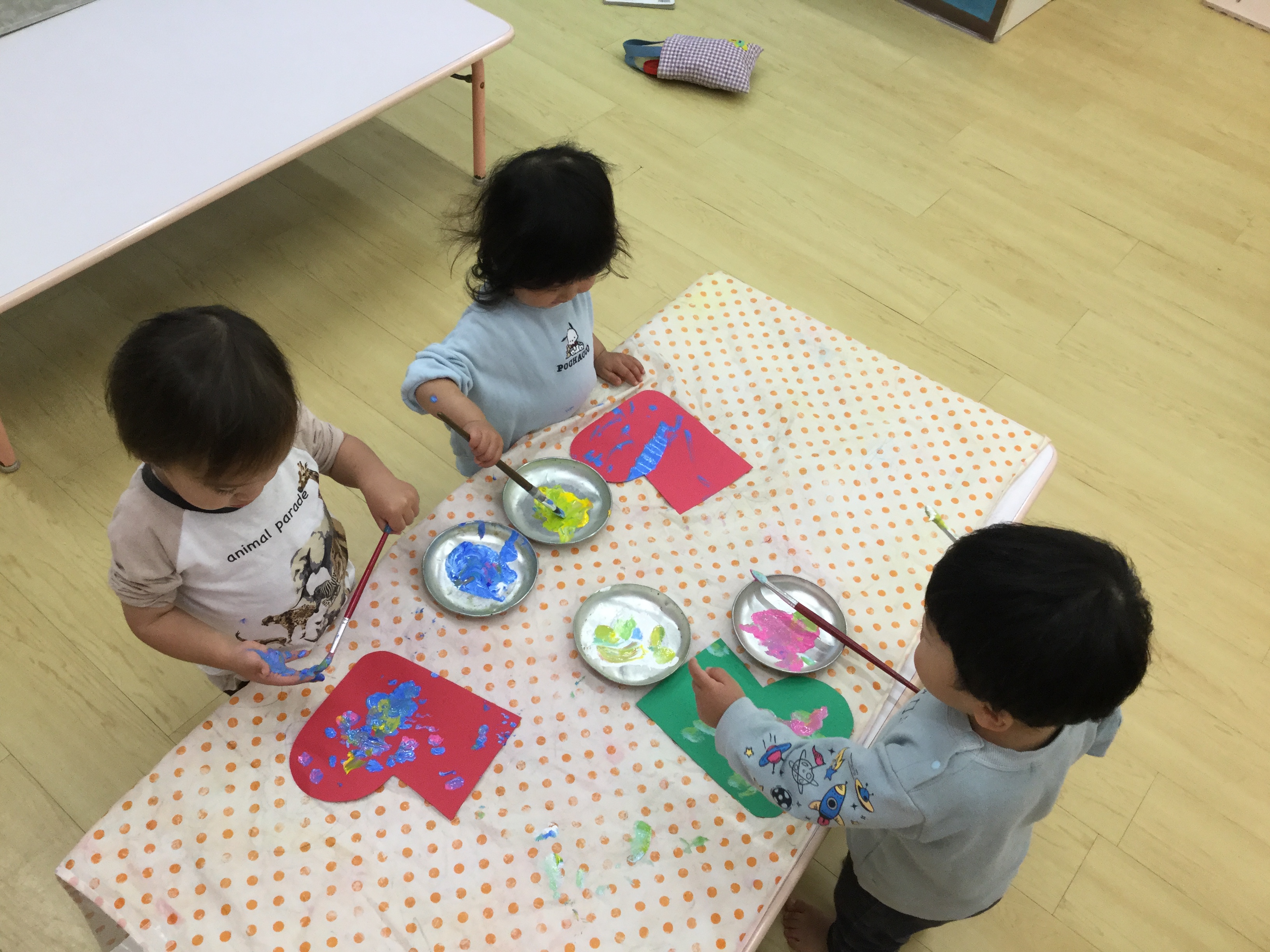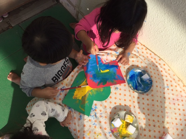自分の手に絵筆で色を塗る様子も見られ、夢中になって遊んでいました。