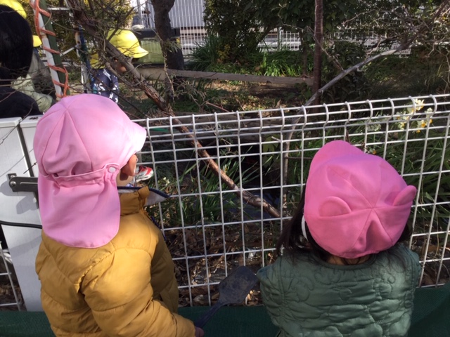 北の川にいる金魚やつららがなっているのをじっくり観察する子どもたち。