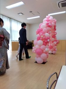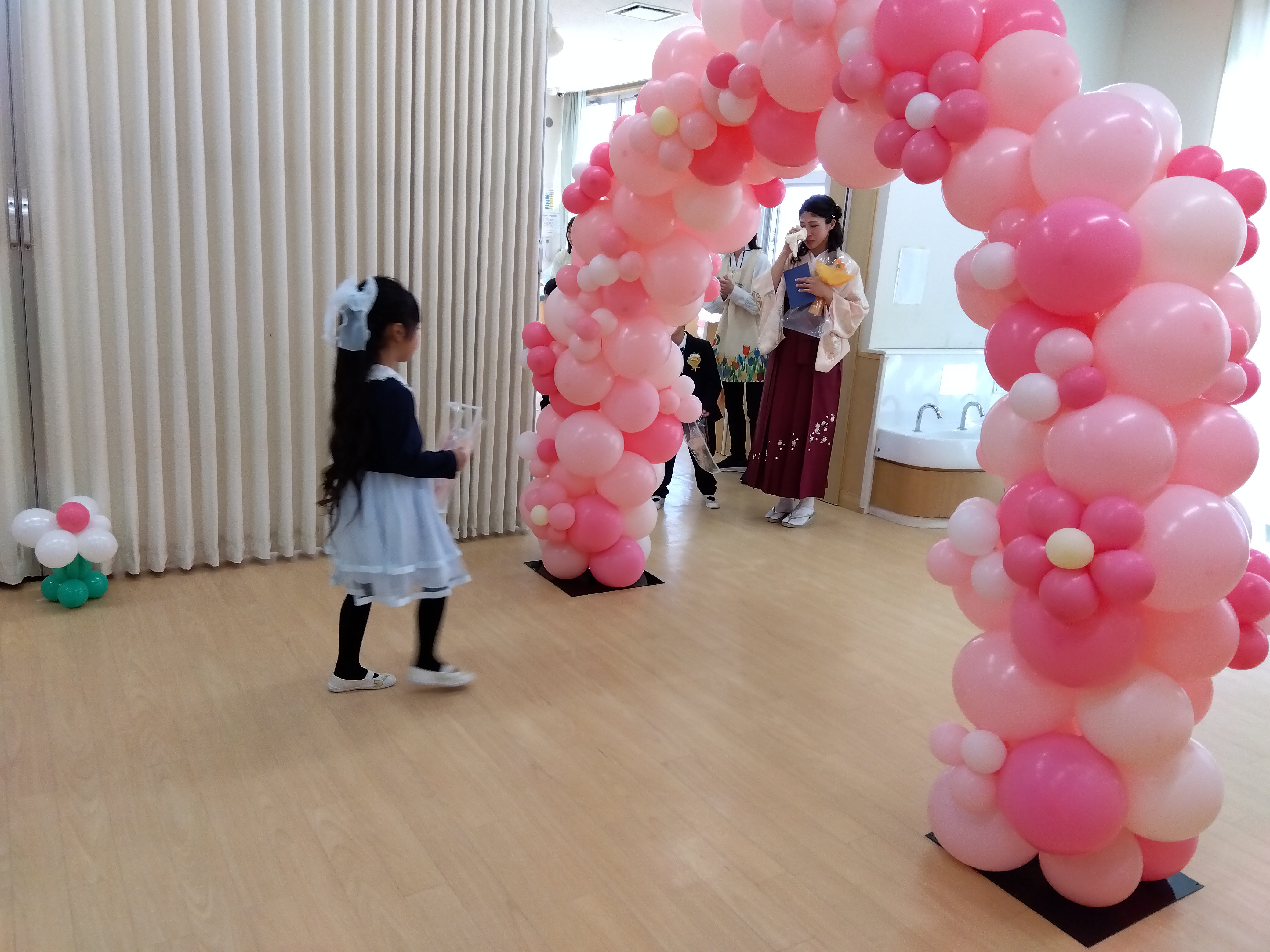 お祝い会が始まると、アーチをくぐって保護者の方と一緒に入場します。