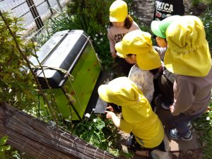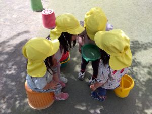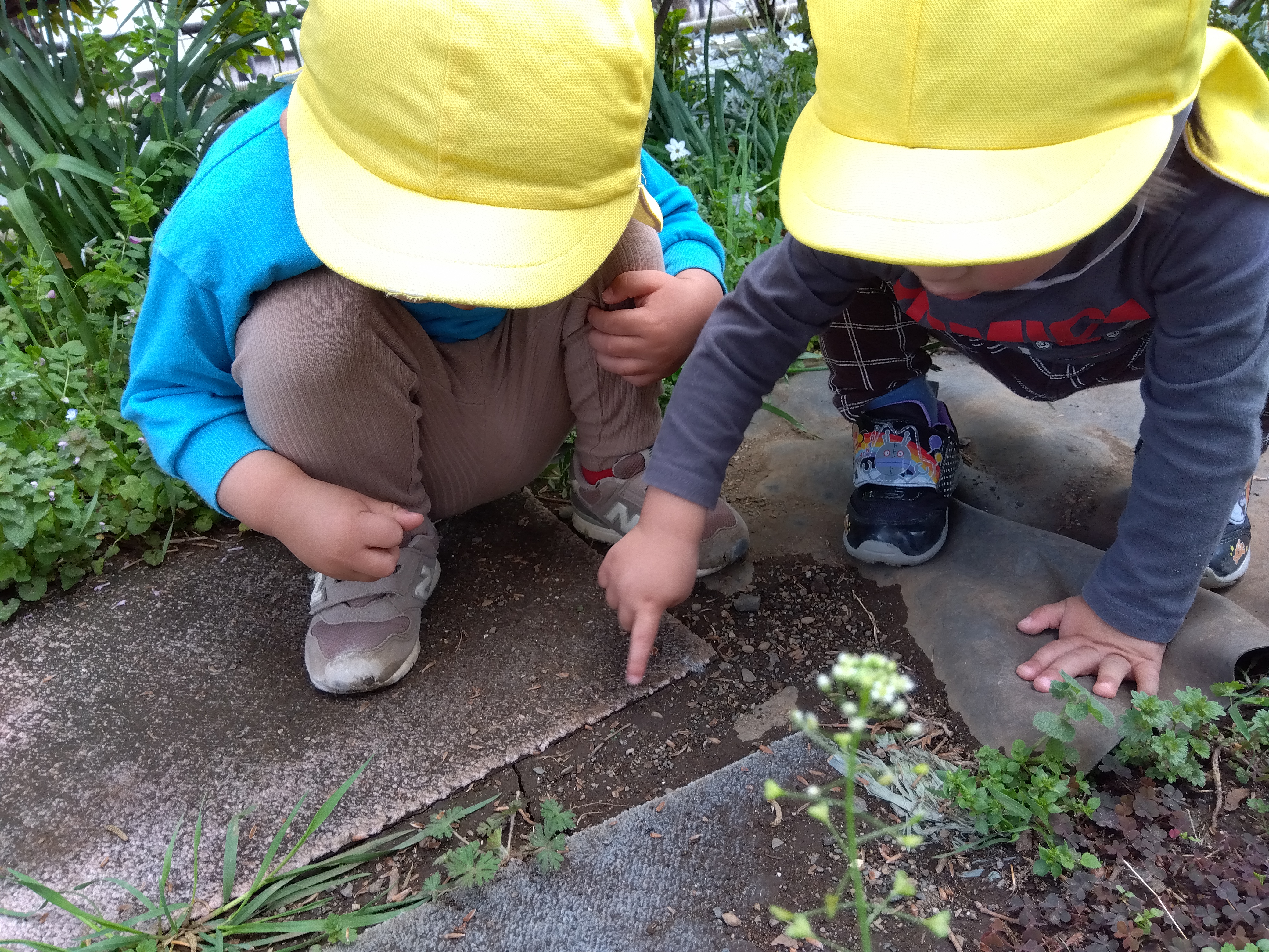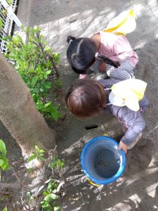 暖かくなり園庭に出ると虫探しに夢中な子どもたち。