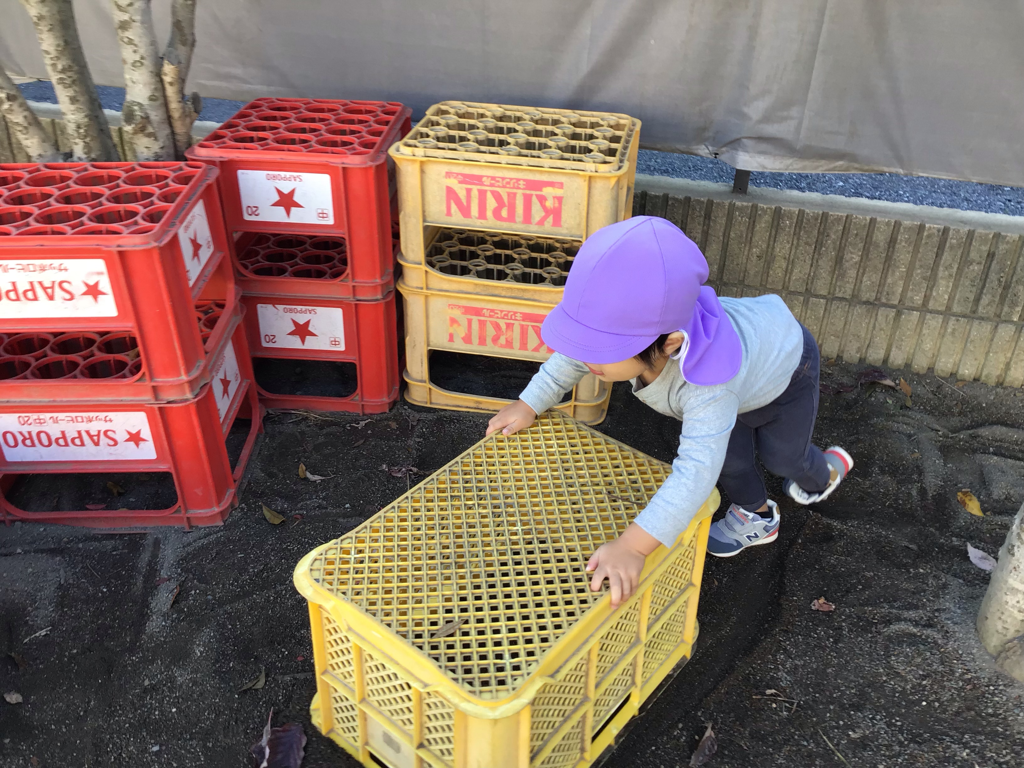 園庭に出ると「まてー!」と追いかけっこを楽しむ子やビールケースを運んで繋げる子もいます。