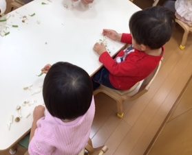 しめじやいんげんを小さくちぎって感触を味わったり、