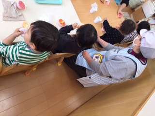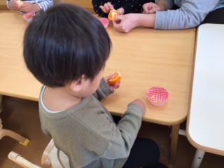「みかんの皮をむいてみてね」と3分の1のみかんが配られると、 嬉しそうに笑顔を見せていた子どもたち。