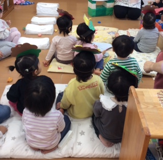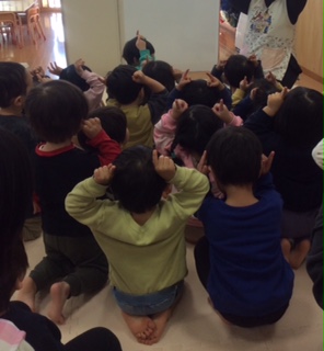 いちご組は初めての節分です。「おにのパンツ」の音楽を流すと身体を揺らしたり、頭の上で一本指を作って鬼のポーズをしたりと楽しんでいた子どもたちです。