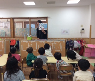 みかん組では、「鬼が来る!」と身構えていた子どもたちでしたが、鬼が来ないことが分かると、ふうっと安心した表情に。「おにのパンツ」を流すと「パン!ツー!」と手を叩いてピース。元気いっぱいに踊っていました。