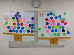 ちゅうりっぷ組さんはカラフルなお団子を糊で上手に貼り制作を楽しんでいました。