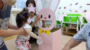 たんぽぽ組さんではお団子に見立てたボールをうさぎさんに食べさせてあげていました。