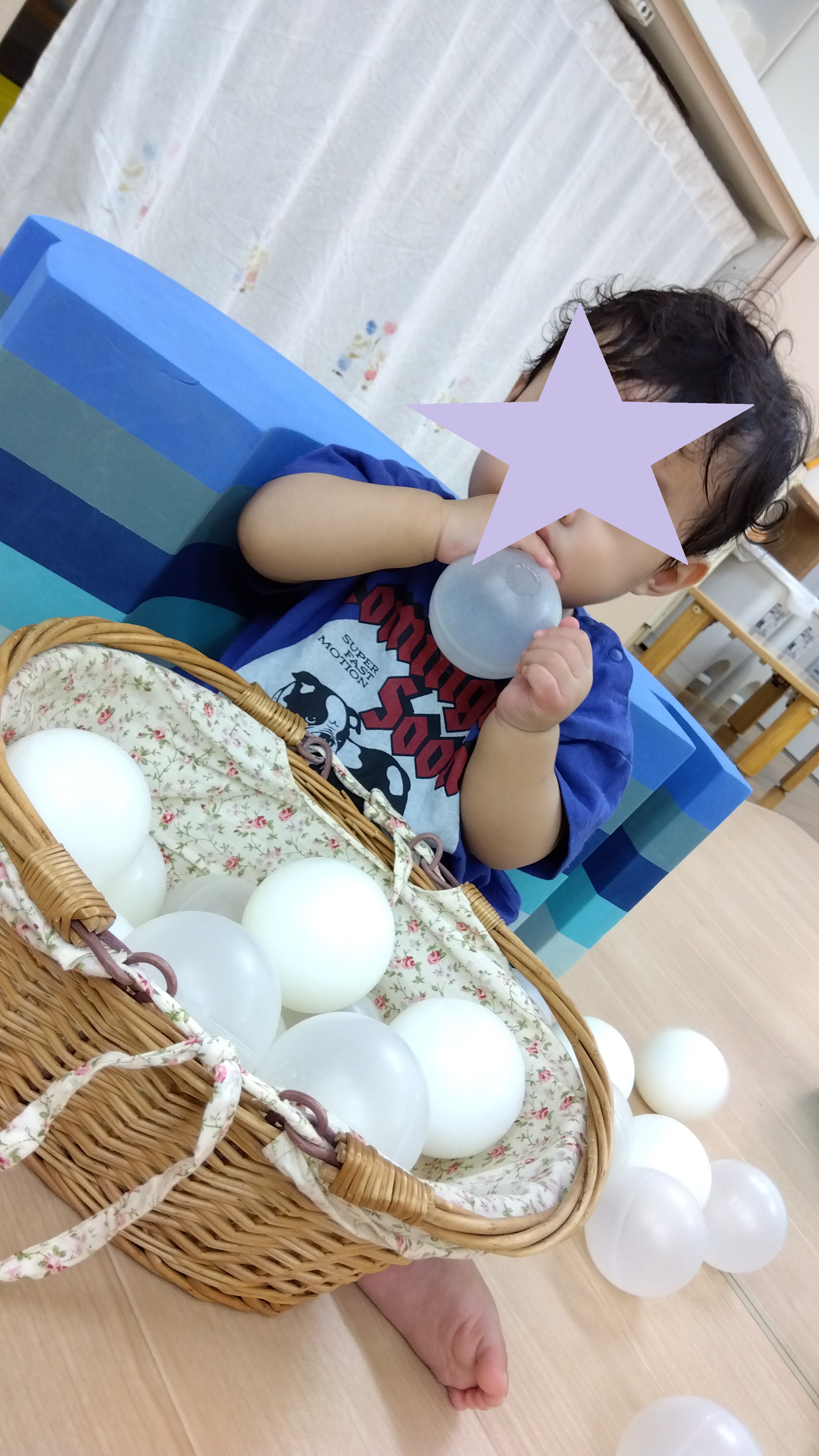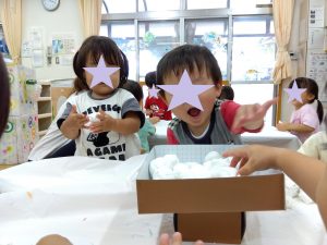 水風船の不思議な感触や氷の冷たさを保育士と一緒に味わう中、最初は初めての物に慎重になる子もいましたが、慣れてくると自ら触れて気持ち良さそうにしていました♪