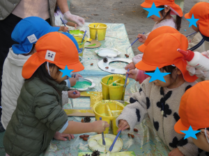 絵具を使ってリースを作ったりしました。絵具コーナーでは色を混ぜ合わせると色が変わって嬉しそうにしていました。また、絵筆を水につけると水にも色が移り、水に色がつく発見をしては「いろがかわるんだよ!」と喜びを共有してくれる可愛らしい姿が見られました。