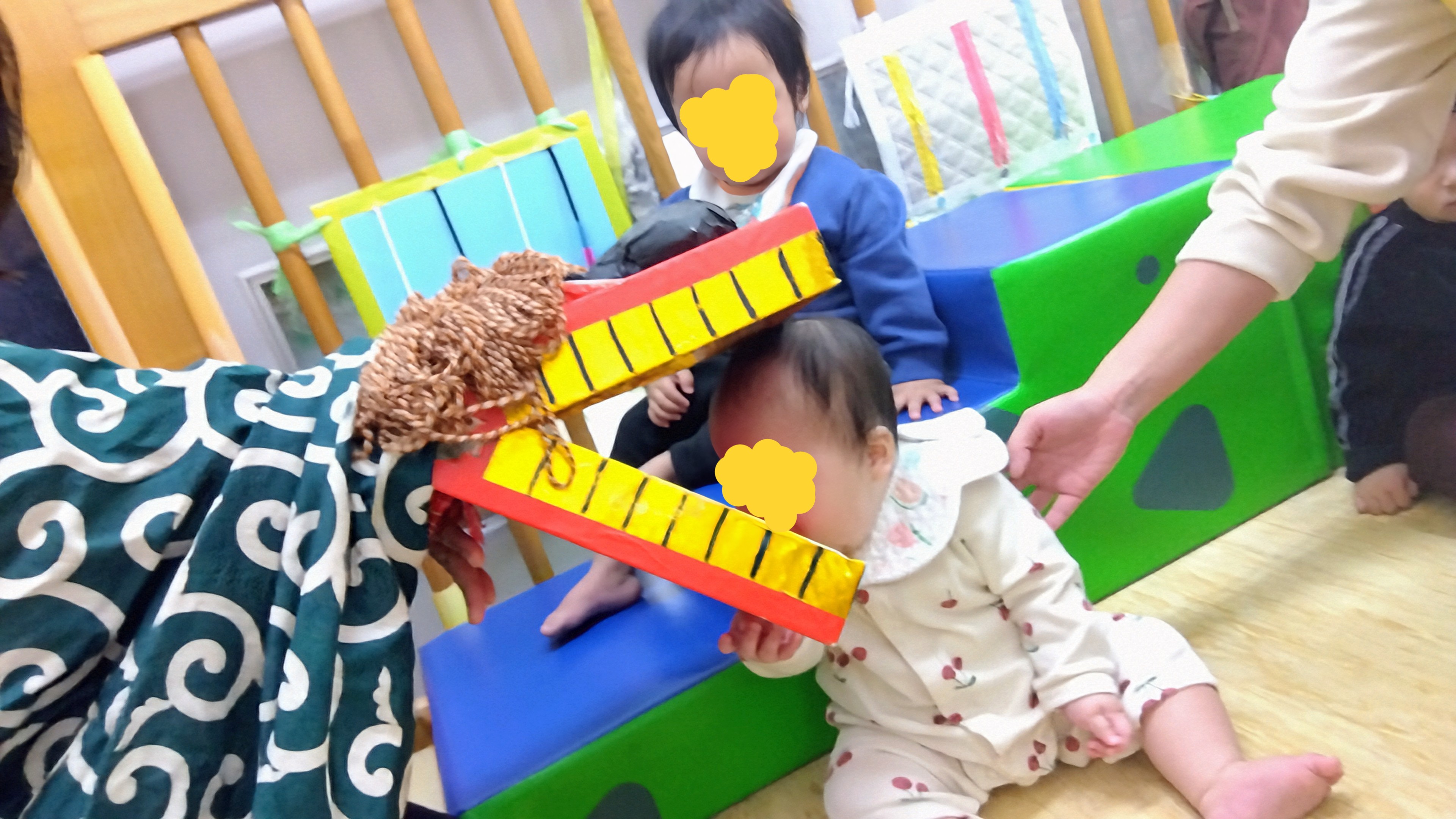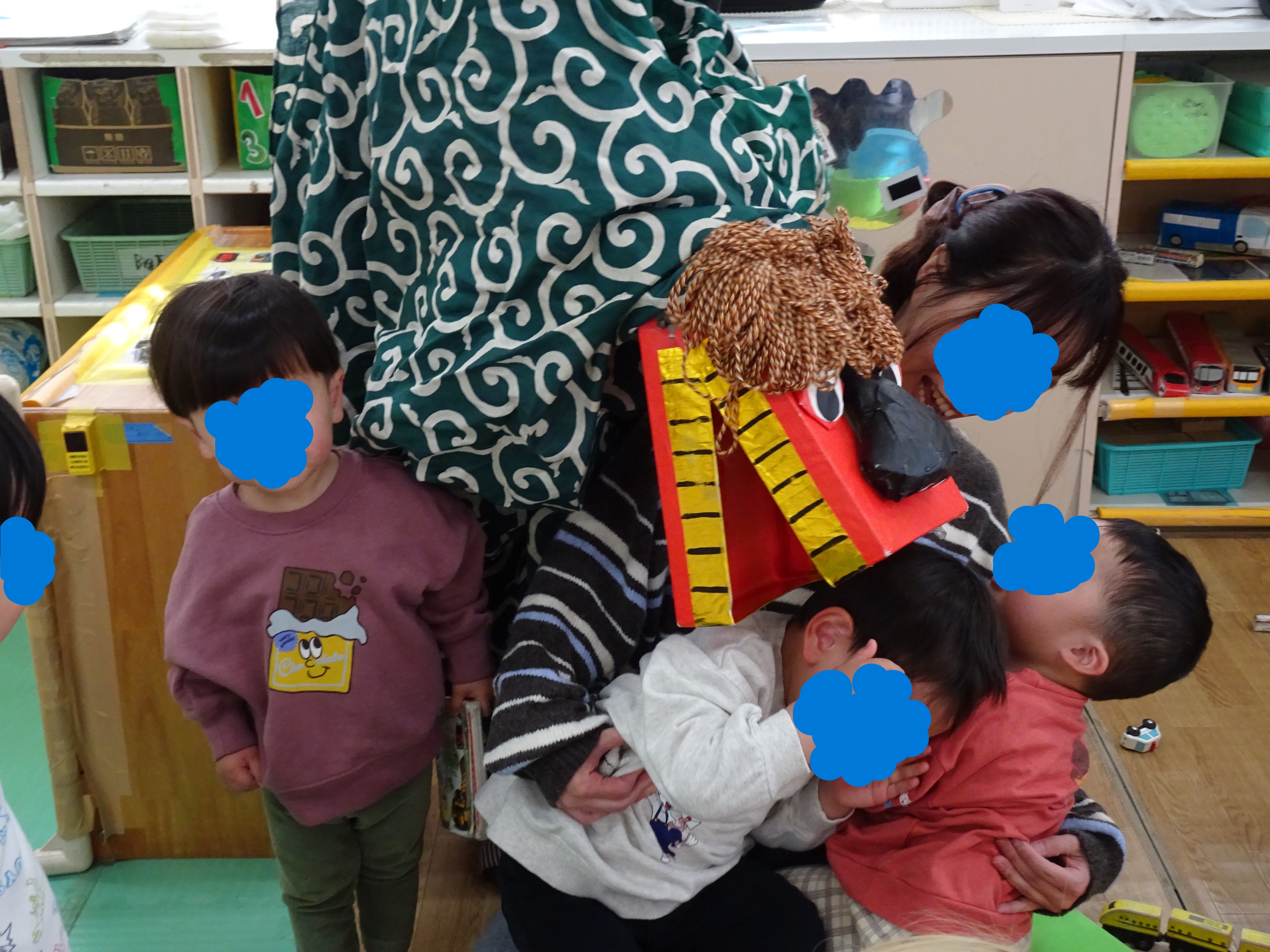 乳児さん(0、1歳児)はお部屋に獅子舞が遊びに来てくれたのですが、ちょっぴりびっくりしている様子でした。中には興味津々で手を伸ばす子もいて可愛らしかったです。
