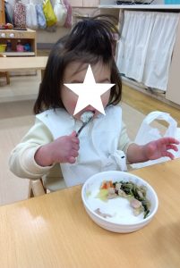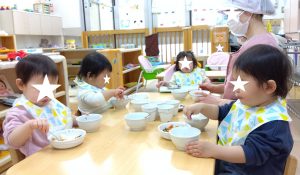”なんでも自分で”とやってみようとしたり、味が分かるようになってきて苦手な食材も出来てきたり…!日々、成長を見せてくれる子どもたちです!