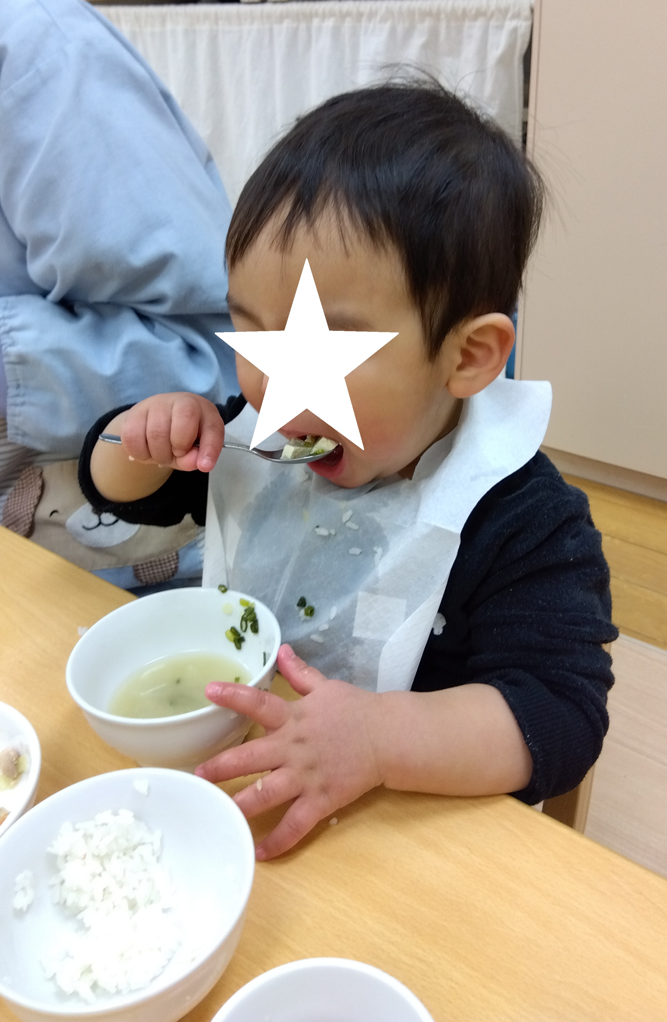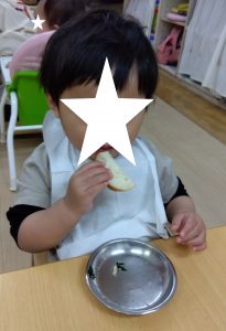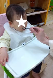 入園当初に比べると、食事の雰囲気や食べ物、ミルクの味に慣れてきてモリモリと食べたり飲んだりする姿が見られるようになりました。