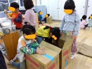 さあ、作り始めました!「これどうする?」「こうしよう!」「ここにつけようよ!」「いいね、そうしよう!」と、友達と話し合いながら協力して作る子ども達でした!
