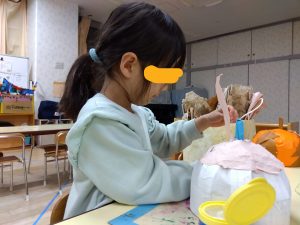 劇中にピクニックがあるのですが、お次はピクニックに必要なバックにお弁当作りです!子ども達は先日遠足に行ったのですが、その時のお弁当が再現している子が多いです!色画用紙に折り紙、花紙を使い色鮮やかに仕上げていました!