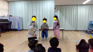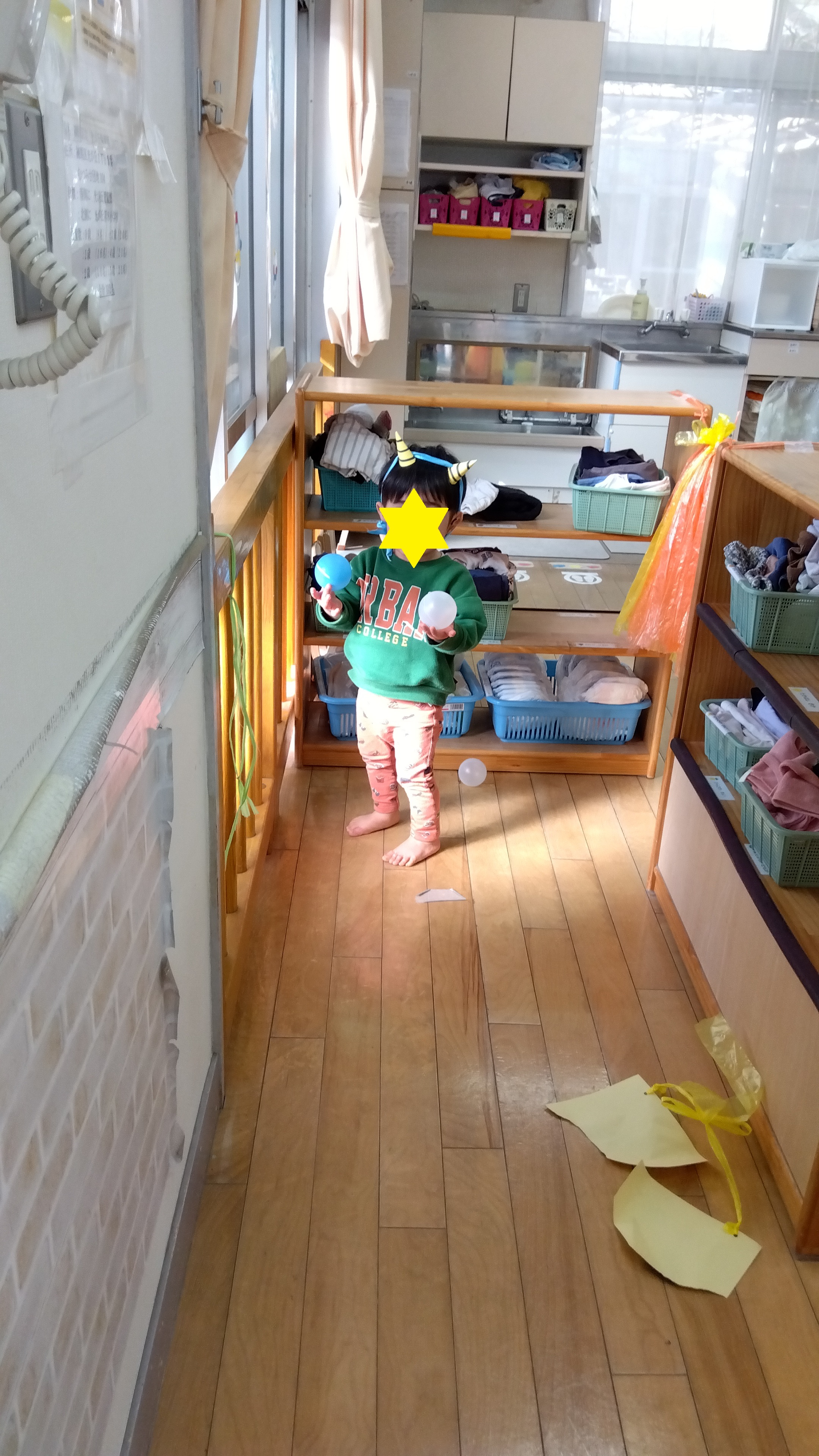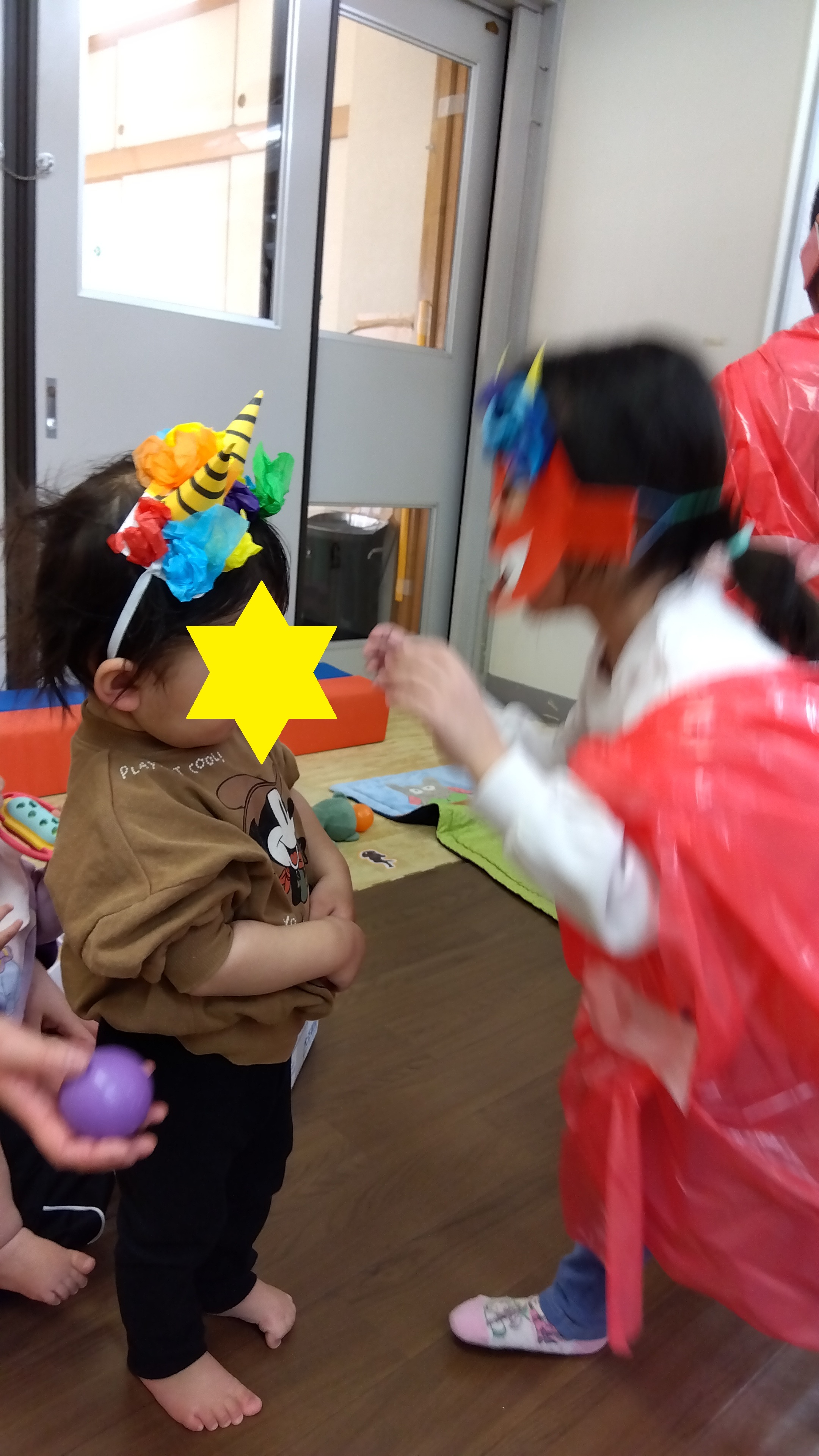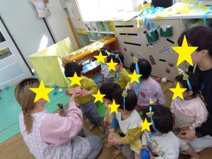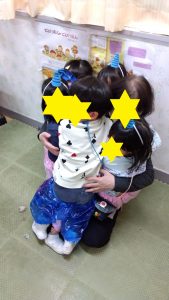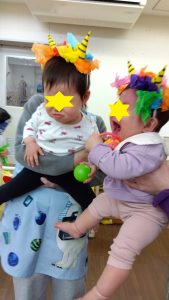 0歳、1歳児クラスのお部屋には、5歳のお兄さんお姉さんオニの登場!「静かに静かに!」「そーっとそーっと!!」「赤ちゃんだから優しくね!」相談しながらオニさん達が登場しました。
