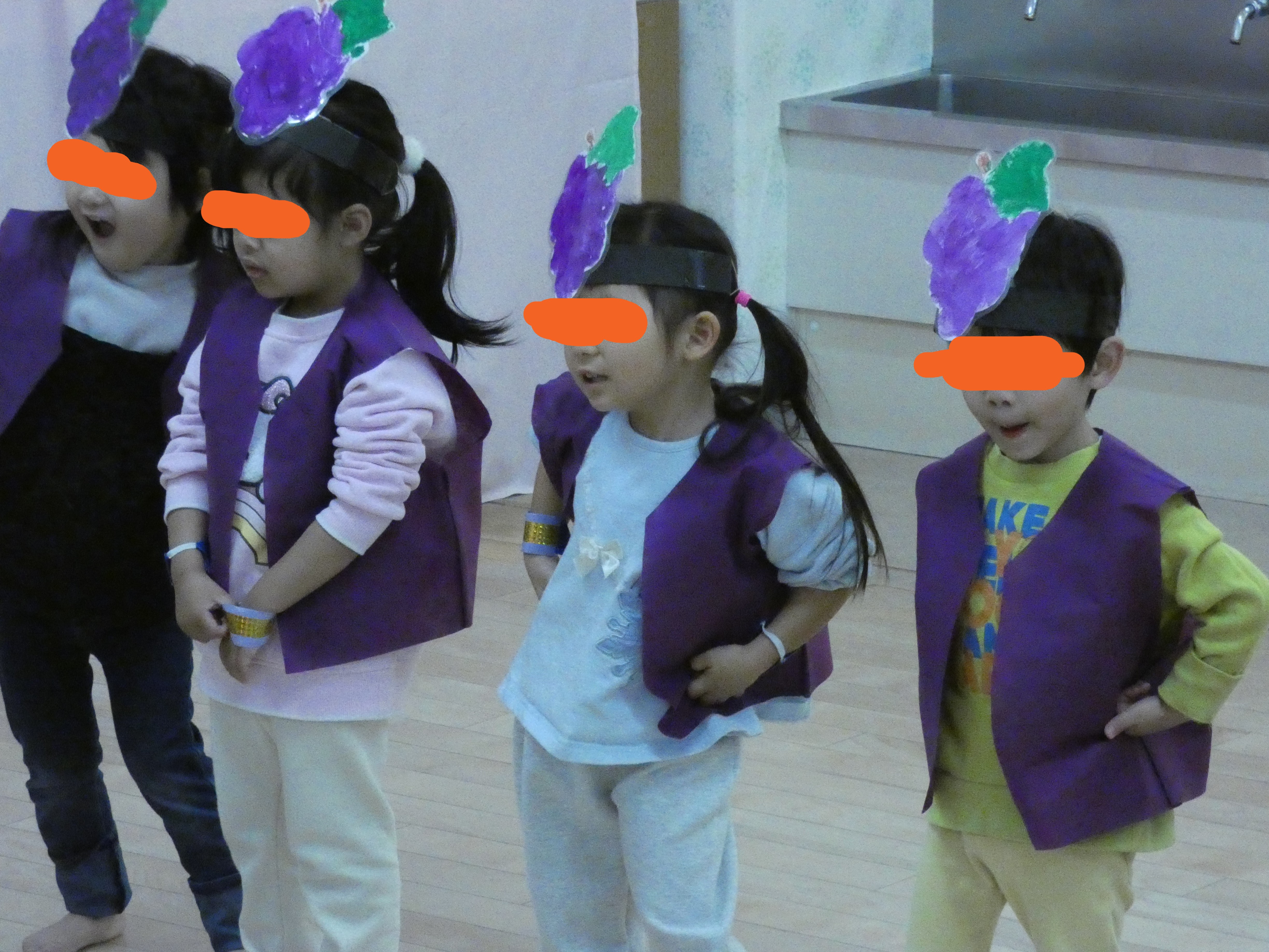 子どもたちが選んだ果物に変身するために衣装を子ども自身で着替えをしていました。変身した果物の名前を呼ばれると大きな声で返事をして、笑顔いっぱいで音楽に合わせて踊っていました。