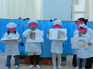 ウクライナ民話の「てぶくろ」と「惑星キャベジ図鑑」の絵本を掛け合わせたオリジナル劇に挑戦しました。