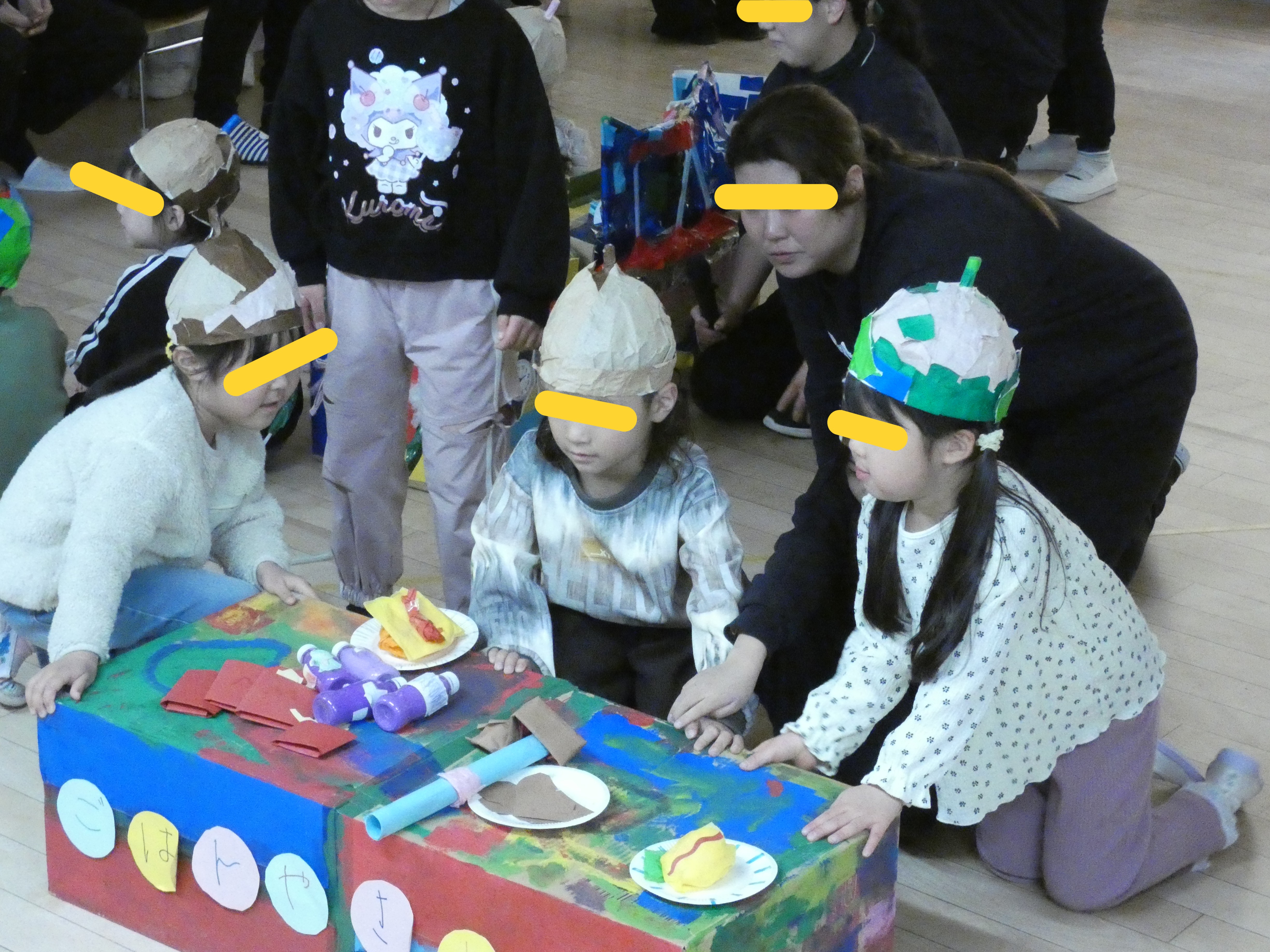 道具なども子どもたちが頑張って作ったものばかり。ごはん・おやつグループや運動会・体育指導グループなど活動のチームごとに緊張しながらも子どもたちの日々の頑張りが伝わってきました。