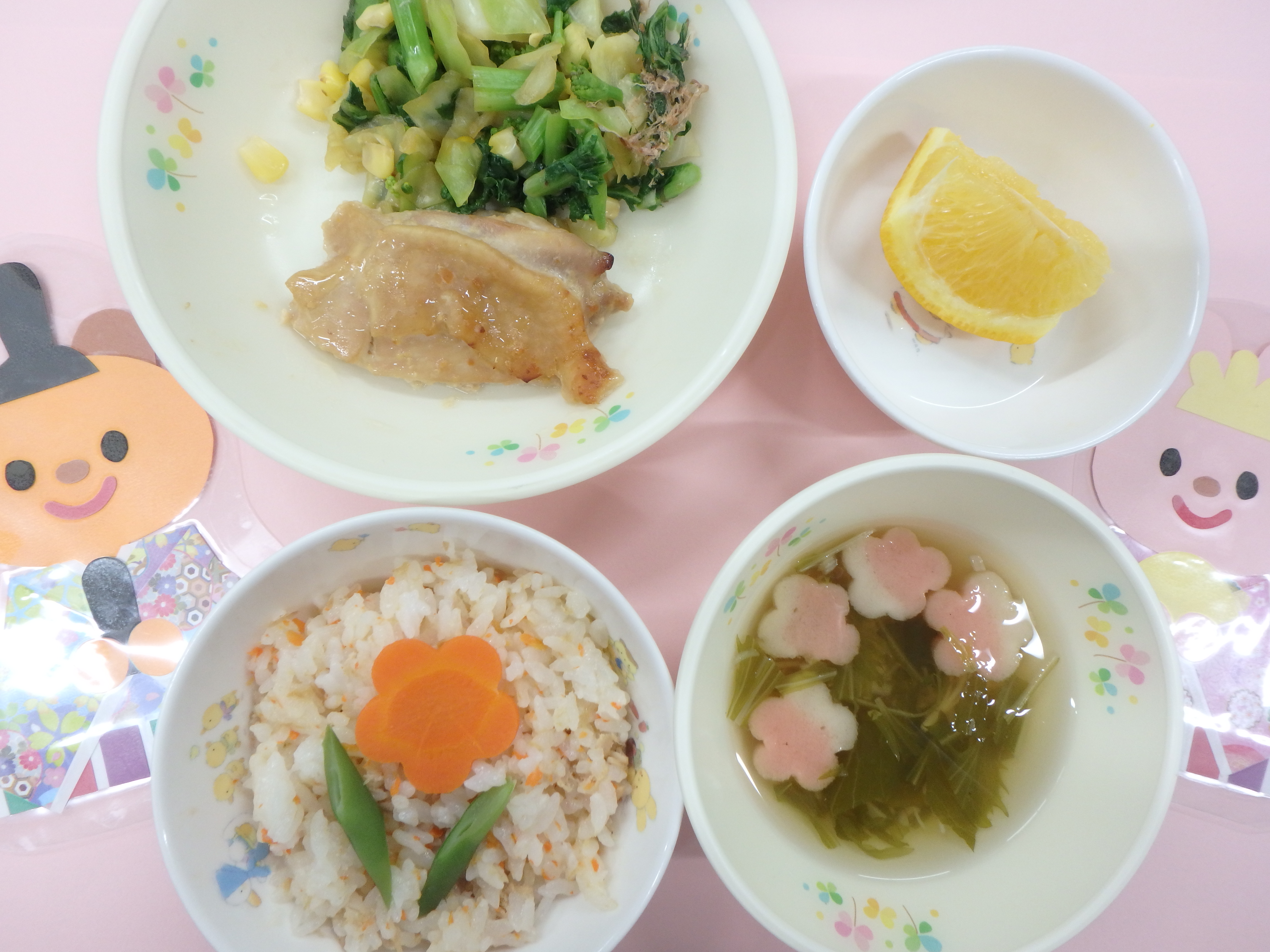 保育園ではひなまつり会が行われ、給食もひなまつり献立になっています。