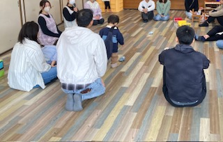 ホールではまずみんなが大好きな「バスに乗って」のリズム遊びから始まりました。ホールで保護者の方がたくさんいていつもと違う雰囲気に少し緊張していた子どもたちも、音楽が流れると少しずつ気持ちが和らぎ可愛らしい笑顔を