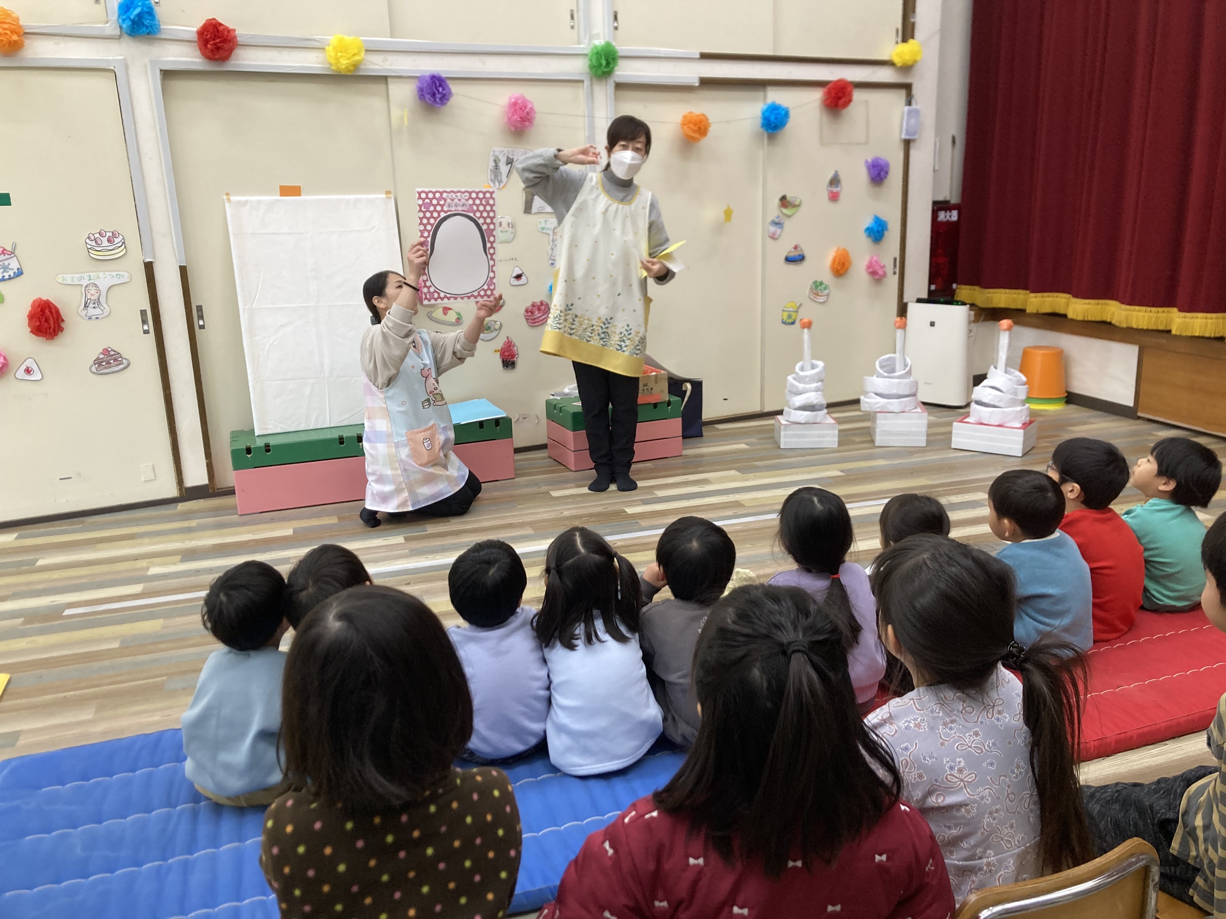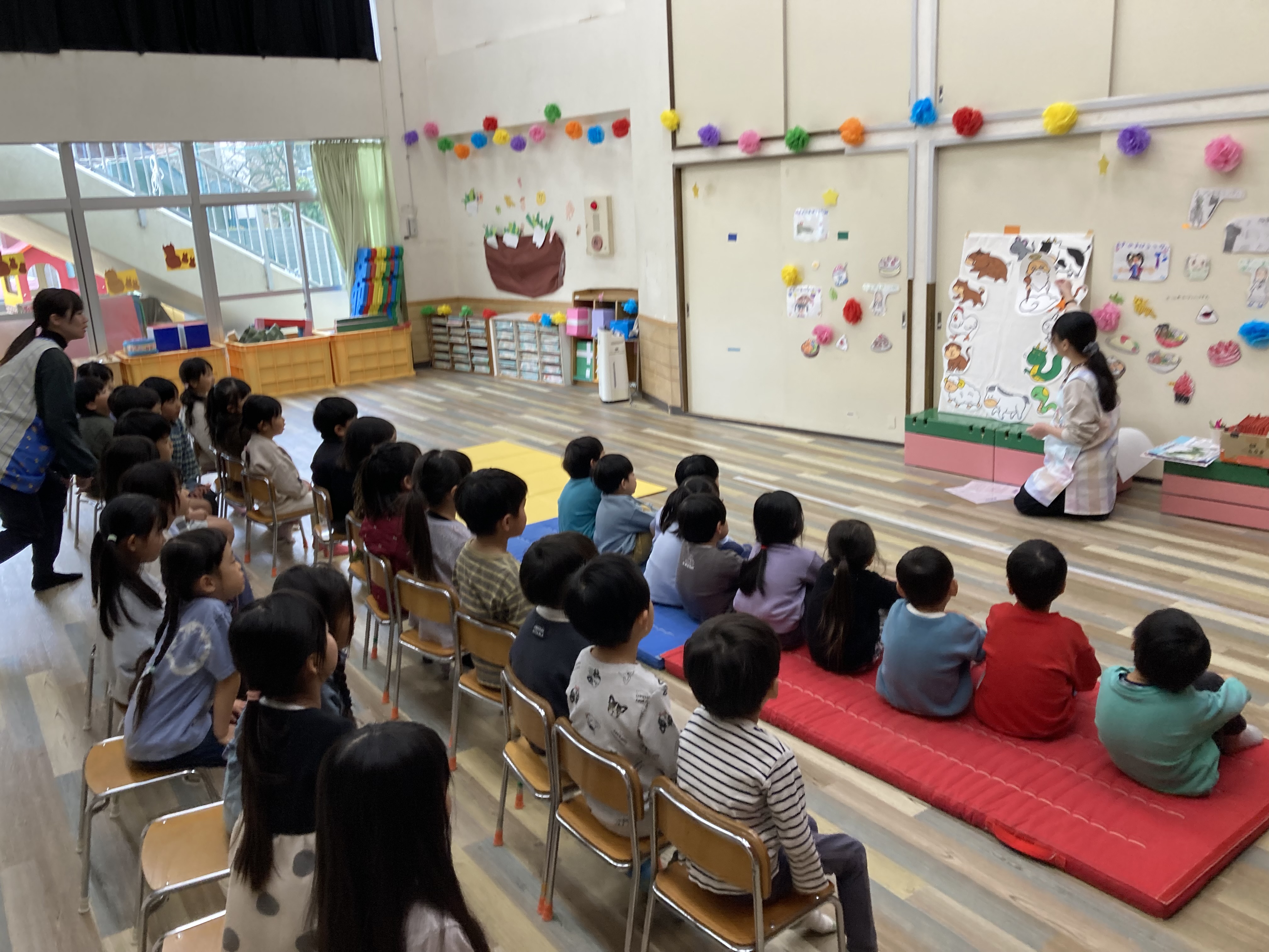 みんな興味をもって正月の話を聞いたり、十二支の話のパネルシアターを観ていた子どもたちは、保育士の問いかけにも元気に答えてくれました。