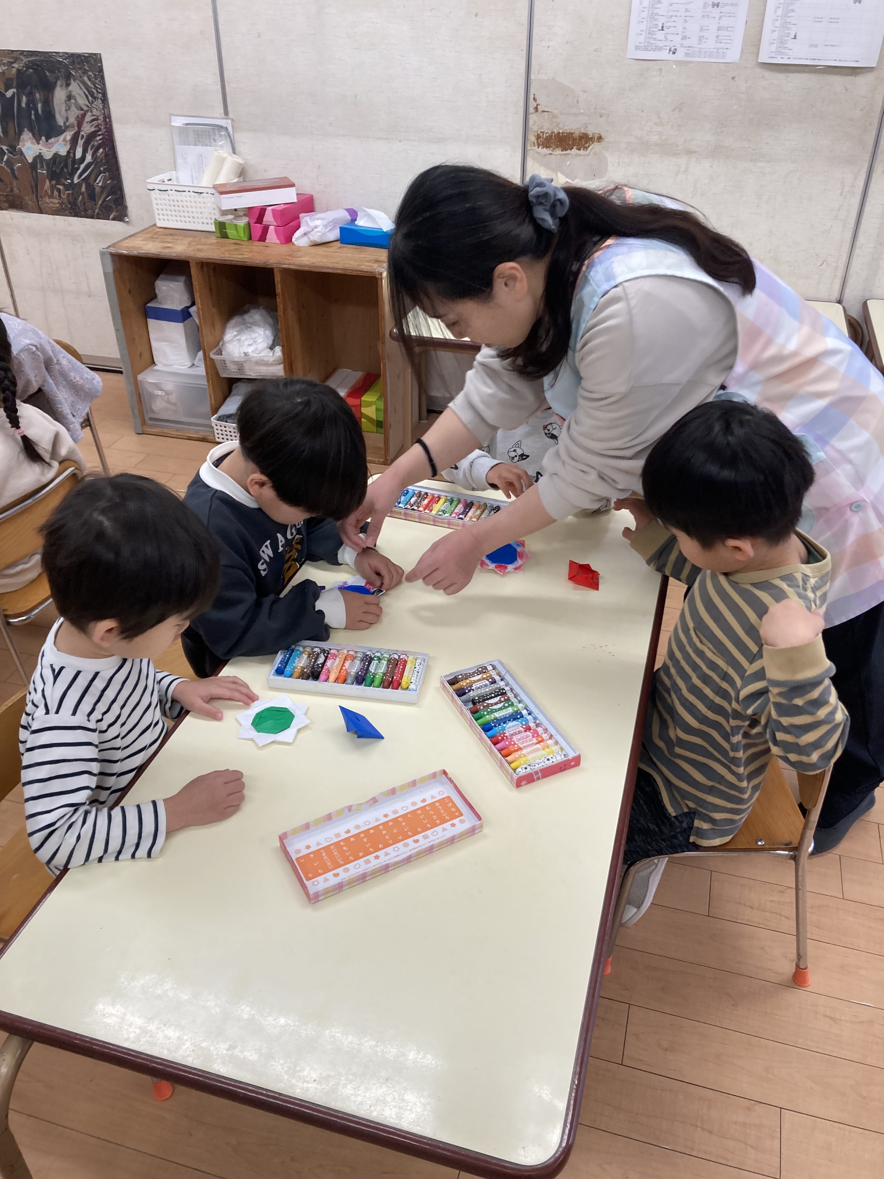保育室では折り紙でコマ作りに挑戦!