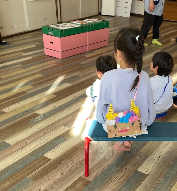 3.4.5歳児の子どもたちが、自分たちで作ったオニのお面や、オニのバックを下げて、ホールに集まりました。