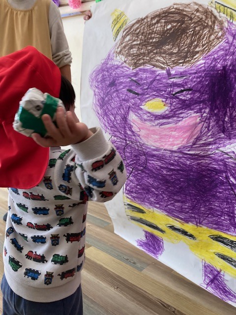 そして、いよいよ新聞紙で作った豆ボールで子どもたちが描いてくれた大きな鬼をやっつけます!