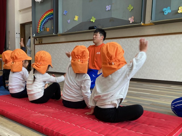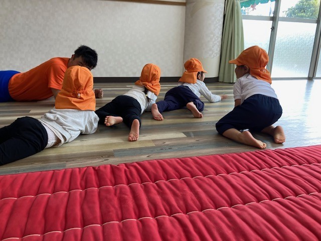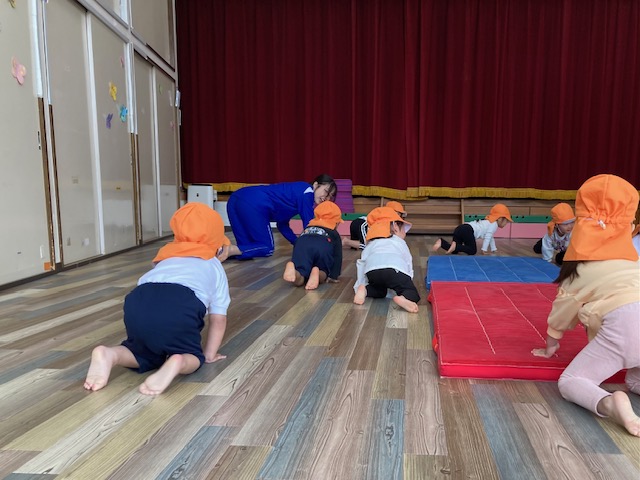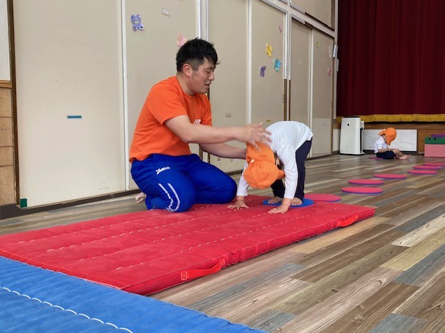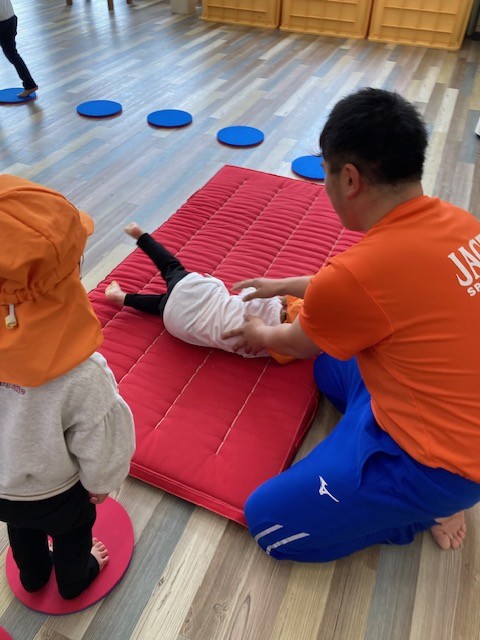 最後は、マットの上で前まわりをしたり、寝っ転がって転がってみたりと最後まで楽しむことができていた子どもたちでした!